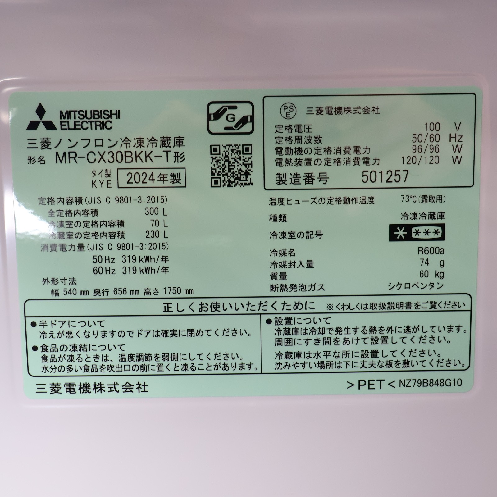 〔展示品〕 冷蔵庫 BKシリーズ ダークブラウン MR-CX30BKK-T [幅54cm /300L /3ドア /右開きタイプ /2024年]