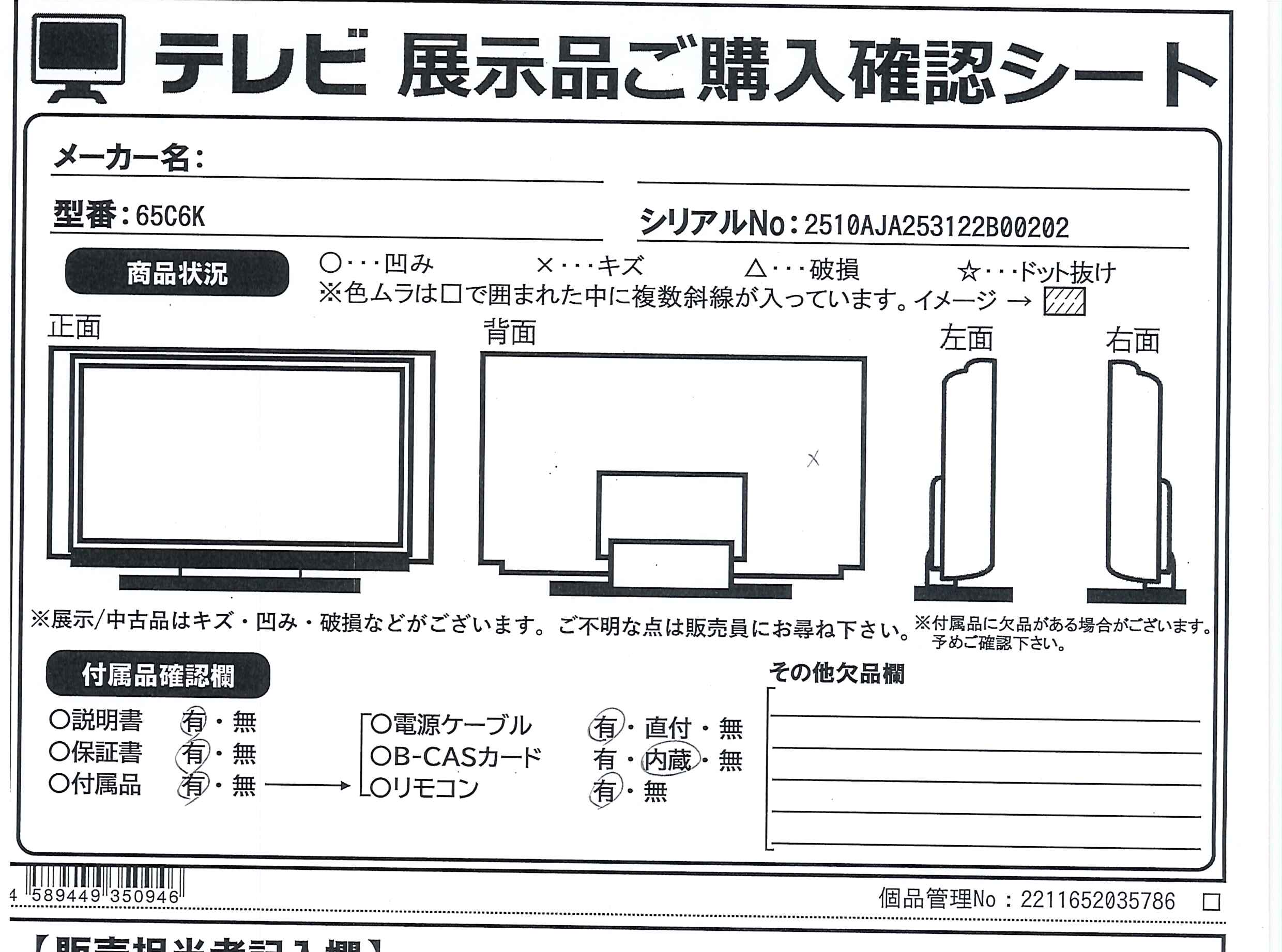 中古商品ランクについて 付属品・商品状態について 〔付属品〕取扱説明書、かんたんガイド、標準リモコン、単四形乾電池×2、電源コード、スタンド一式、クリップ(ケーブル固定用)×3、VESAネジ×2、転倒落下防止用部品一式