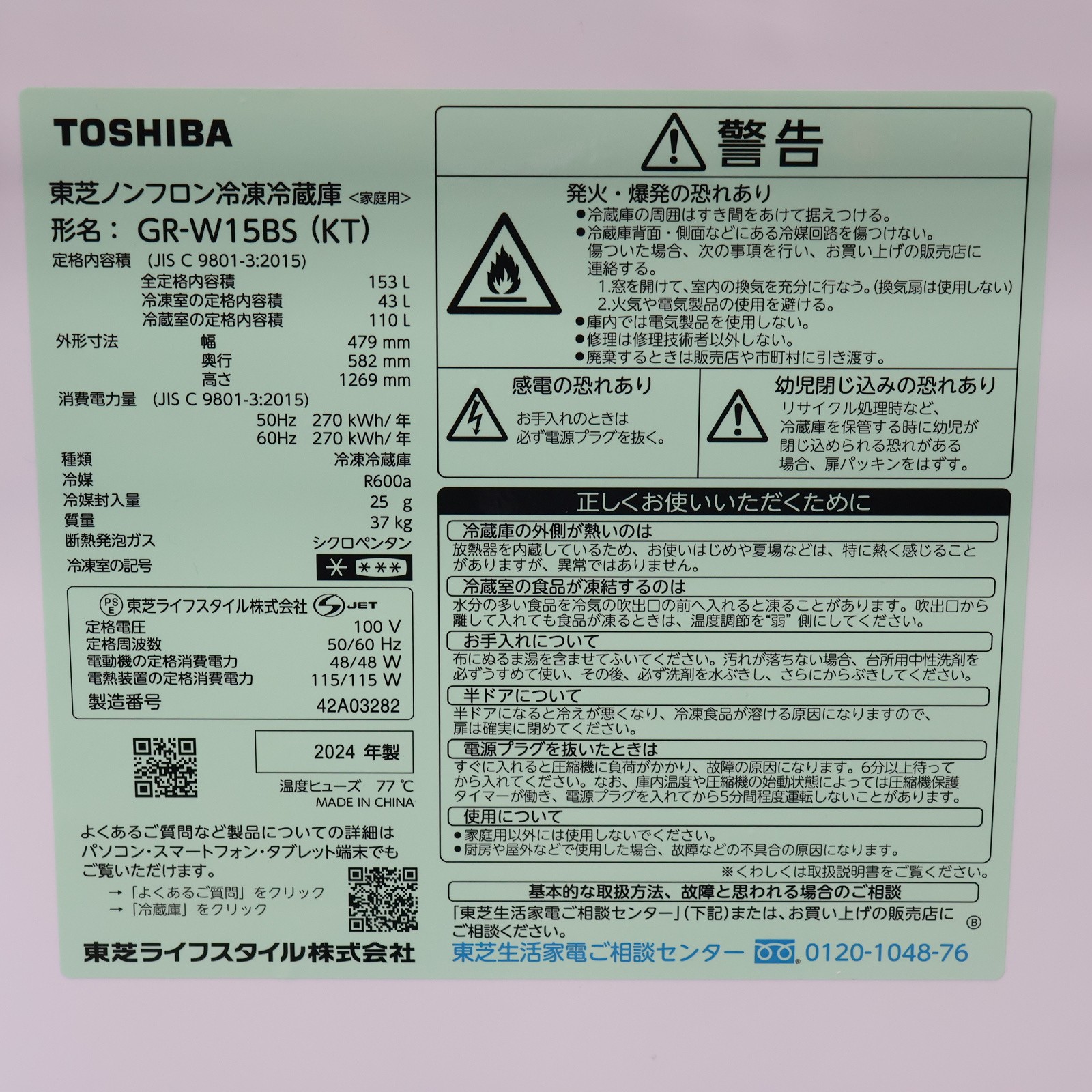 〔展示品〕 冷蔵庫 BSシリーズ エクリュブラック GR-W15BS-KT [幅47.9cm /153L /2ドア /右開きタイプ /2024年]