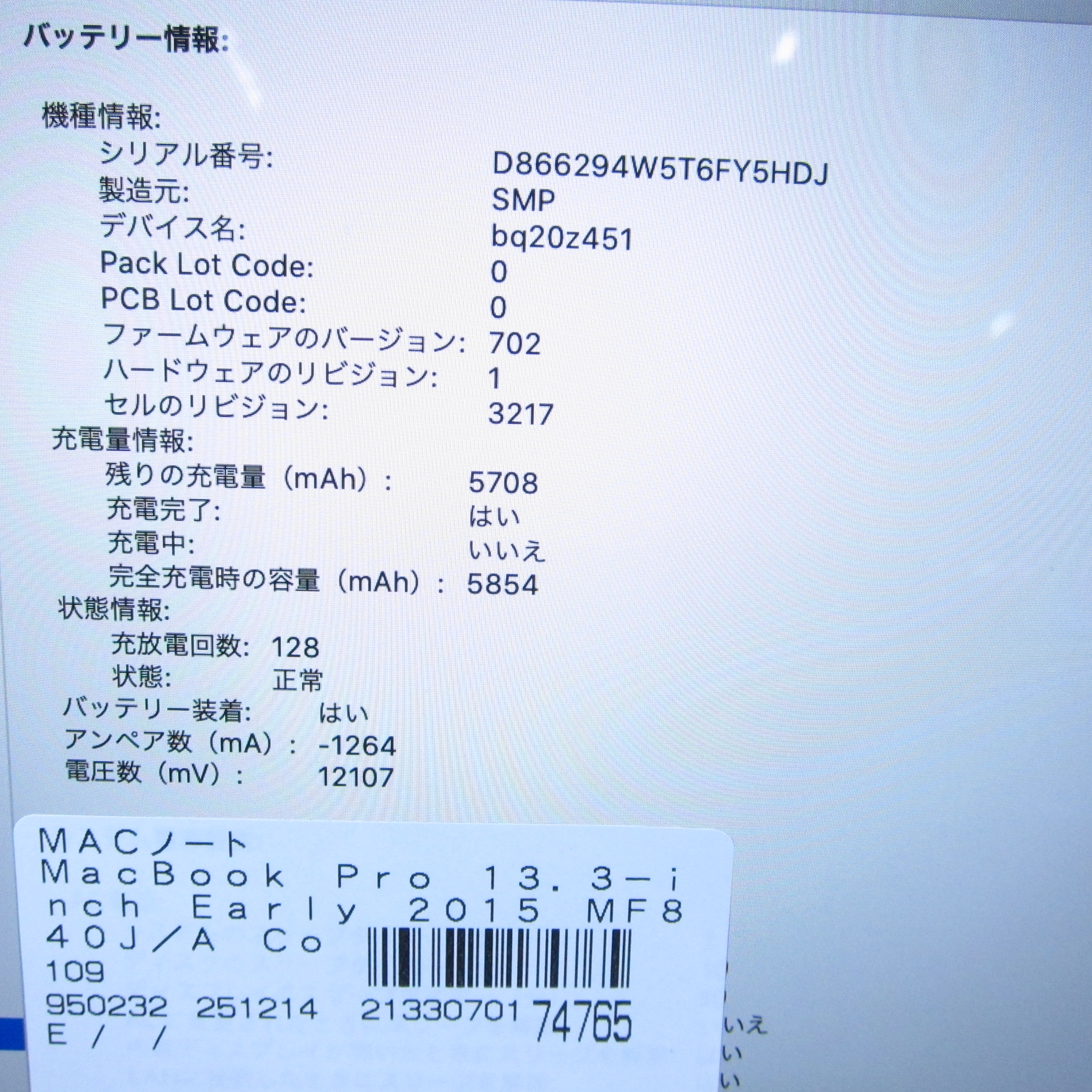 【CPU】Core i5(2.7GHz)、【メモリ】8GB、【SSD】256GB、【ドライブ】無し、【モニター】13.3インチ、【グラフィック】Intel Iris Graphics 6100、【OS】OS X