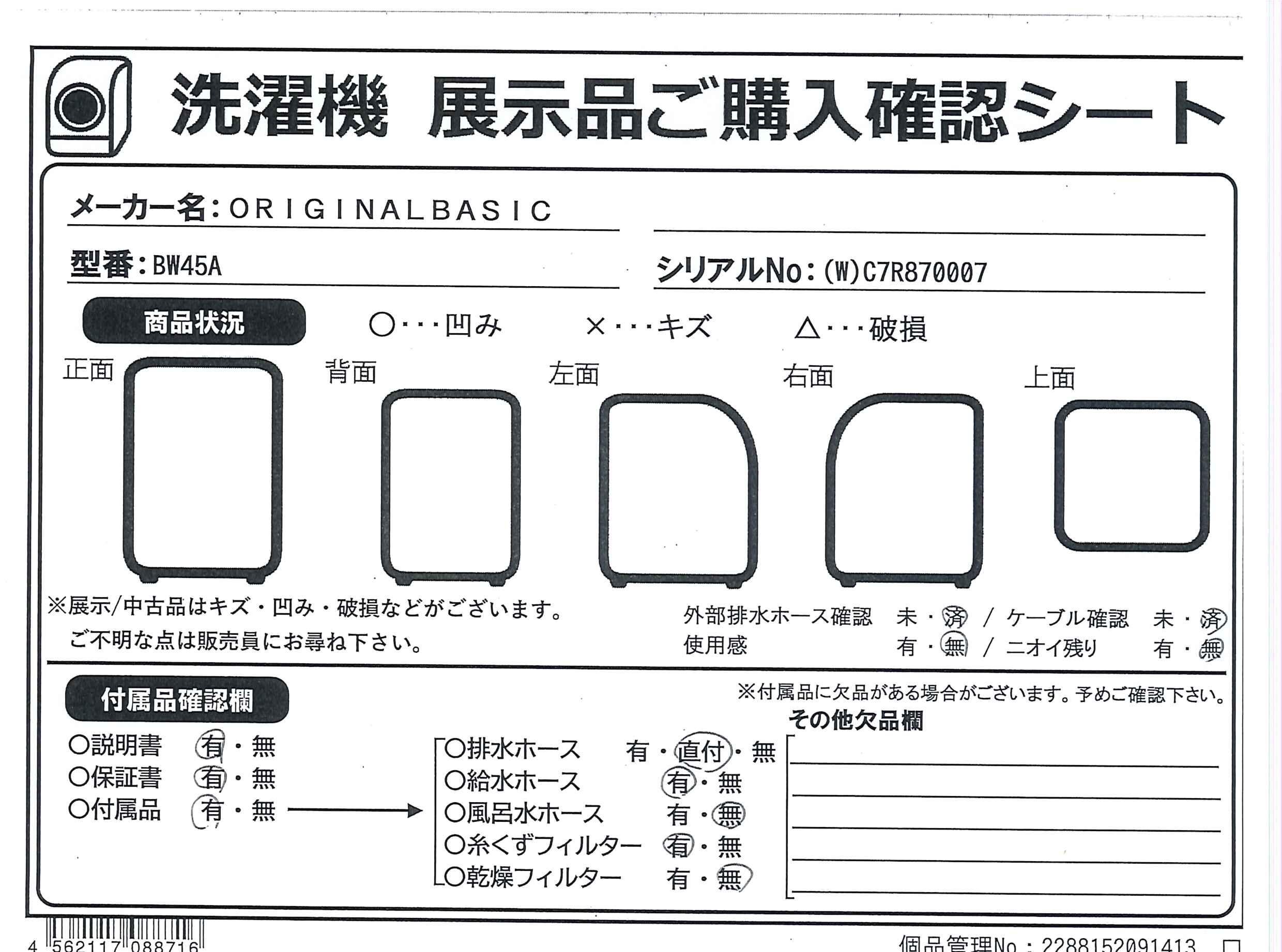 中古商品ランクについて 付属品・商品状態について 〔付属品〕取扱説明書、マジックつぎ手、給水ホース、糸くずフィルター