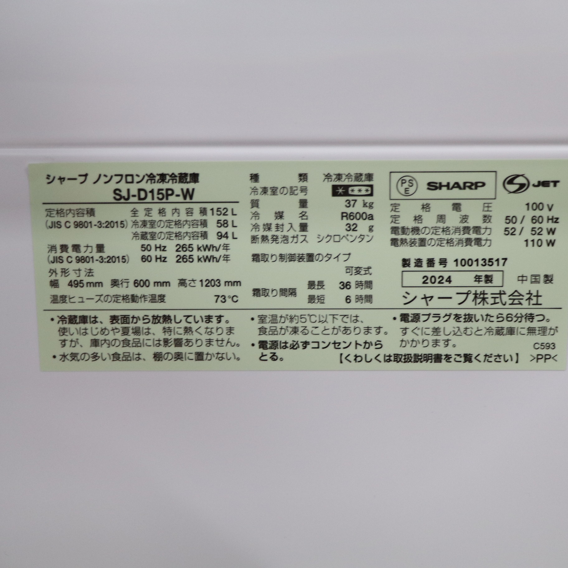 商品名 〔展示品〕 冷蔵庫 マットホワイト SJ-D15P-W [幅49.5cm /152L /2ドア /右開き/左開き付け替えタイプ /2024年]