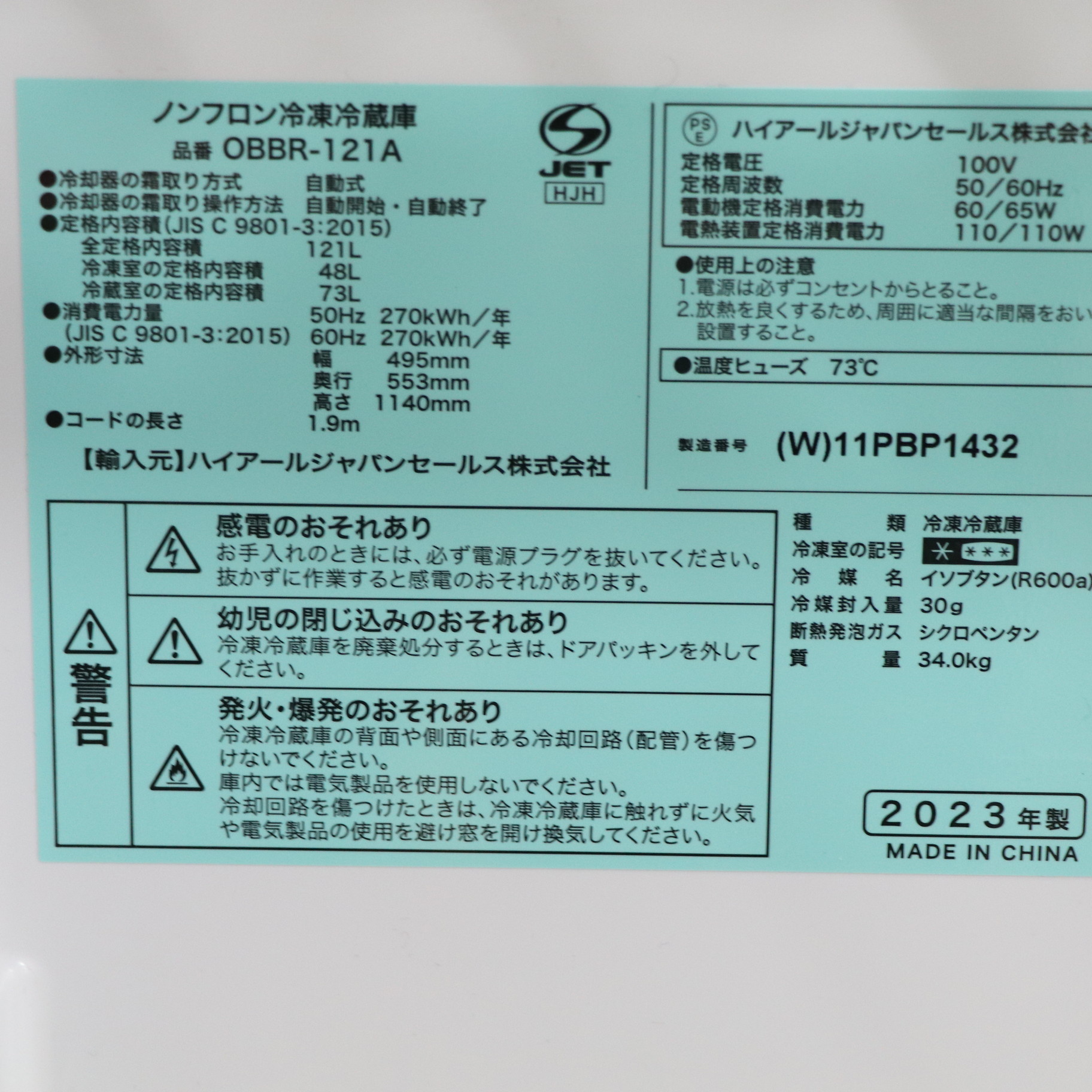 〔展示品〕 冷蔵庫 ホワイト OBBR-121A-W [幅49.5cm /121L /2ドア /右開きタイプ /2023年]