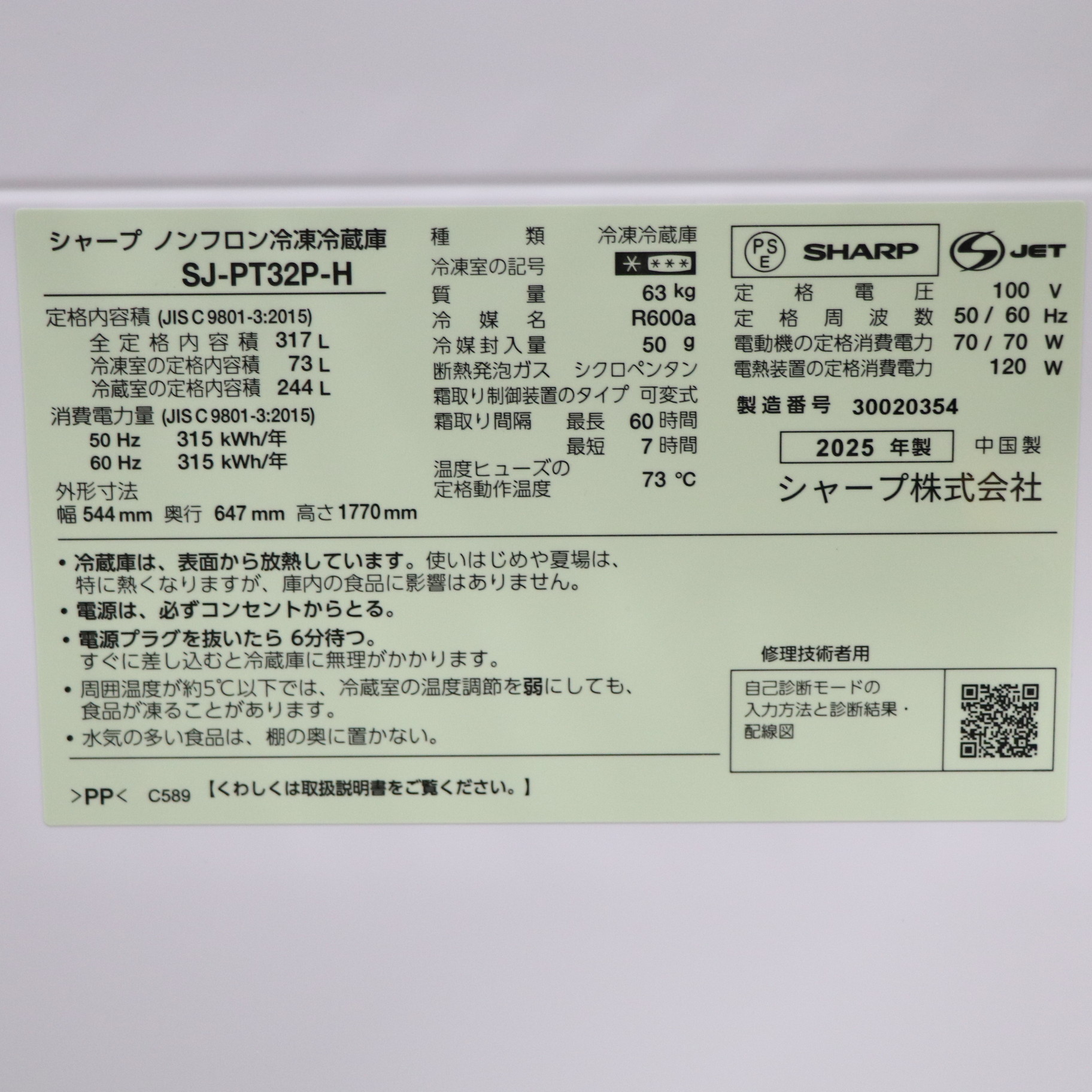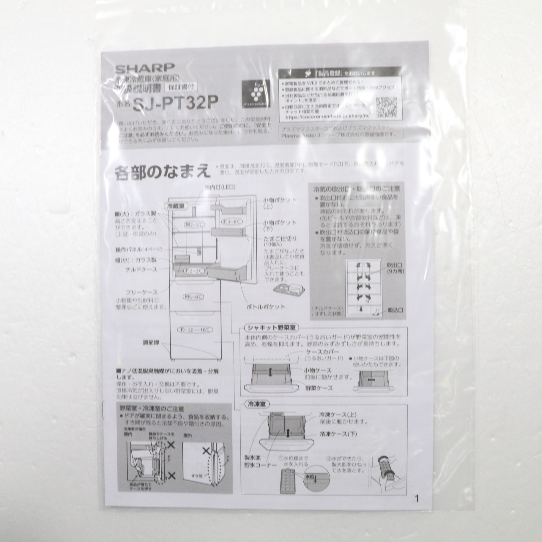 〔中古品〕 冷蔵庫 マットグレー SJ-PT32P-H [幅54.4cm /317L /3ドア /右開きタイプ /2024年]