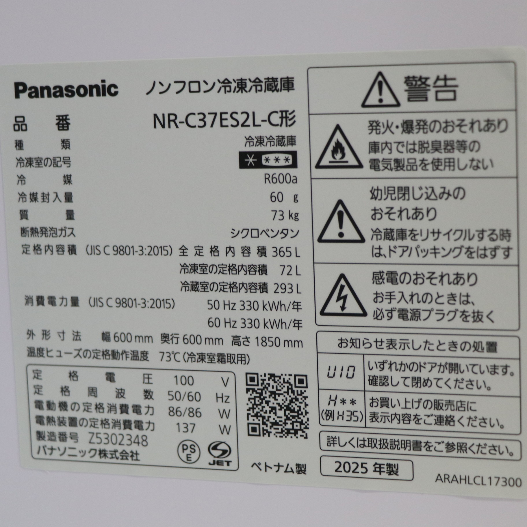 〔中古品〕 冷蔵庫 ESタイプ マットベージュ NR-C37ES2L-C [幅60cm /365L /3ドア /左開きタイプ /2025年]