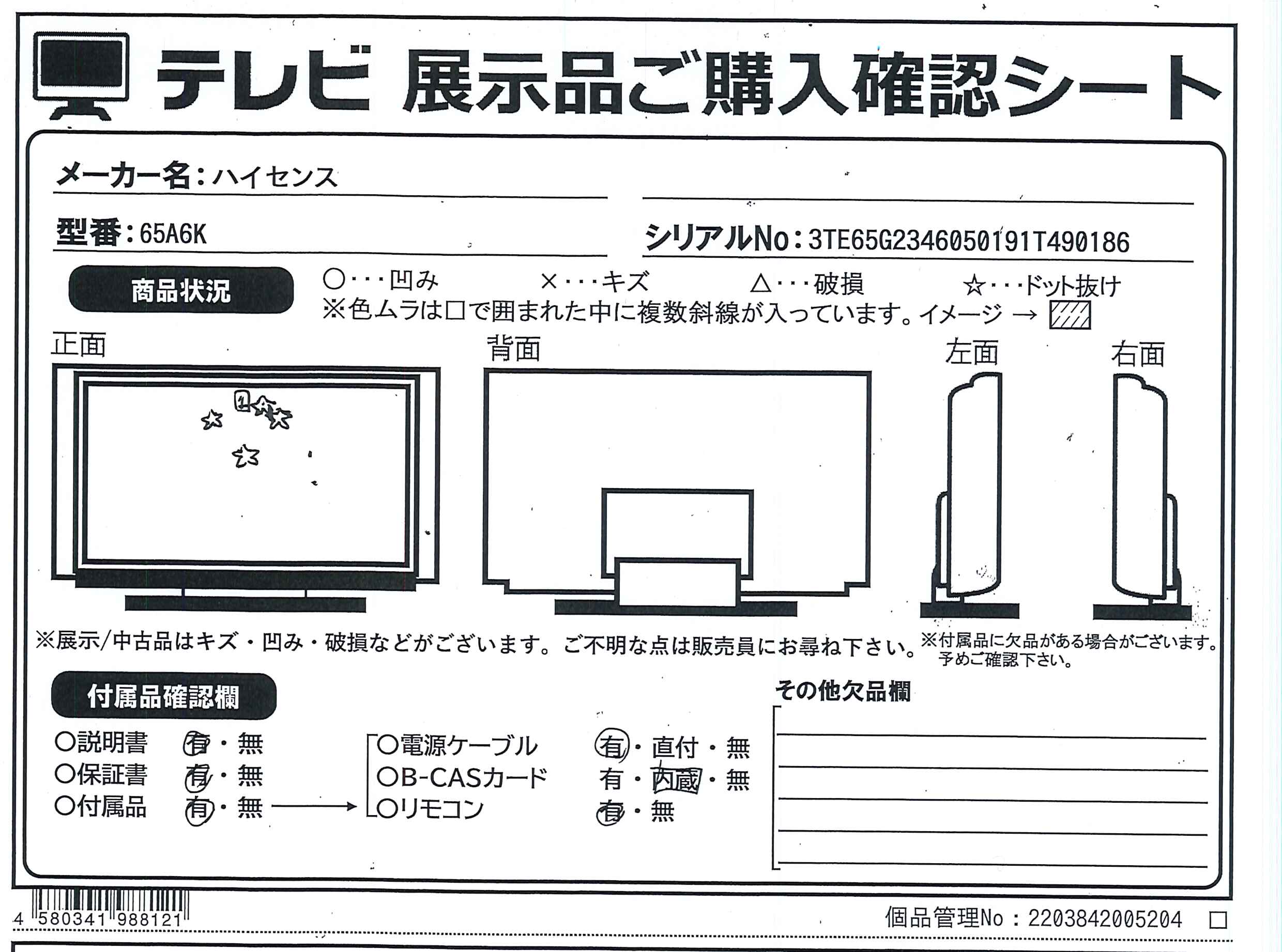 〔展示品〕 液晶テレビ 65A6K [65V型 /Bluetooth対応 /4K対応 /BS・CS 4Kチューナー内蔵 /YouTube対応]