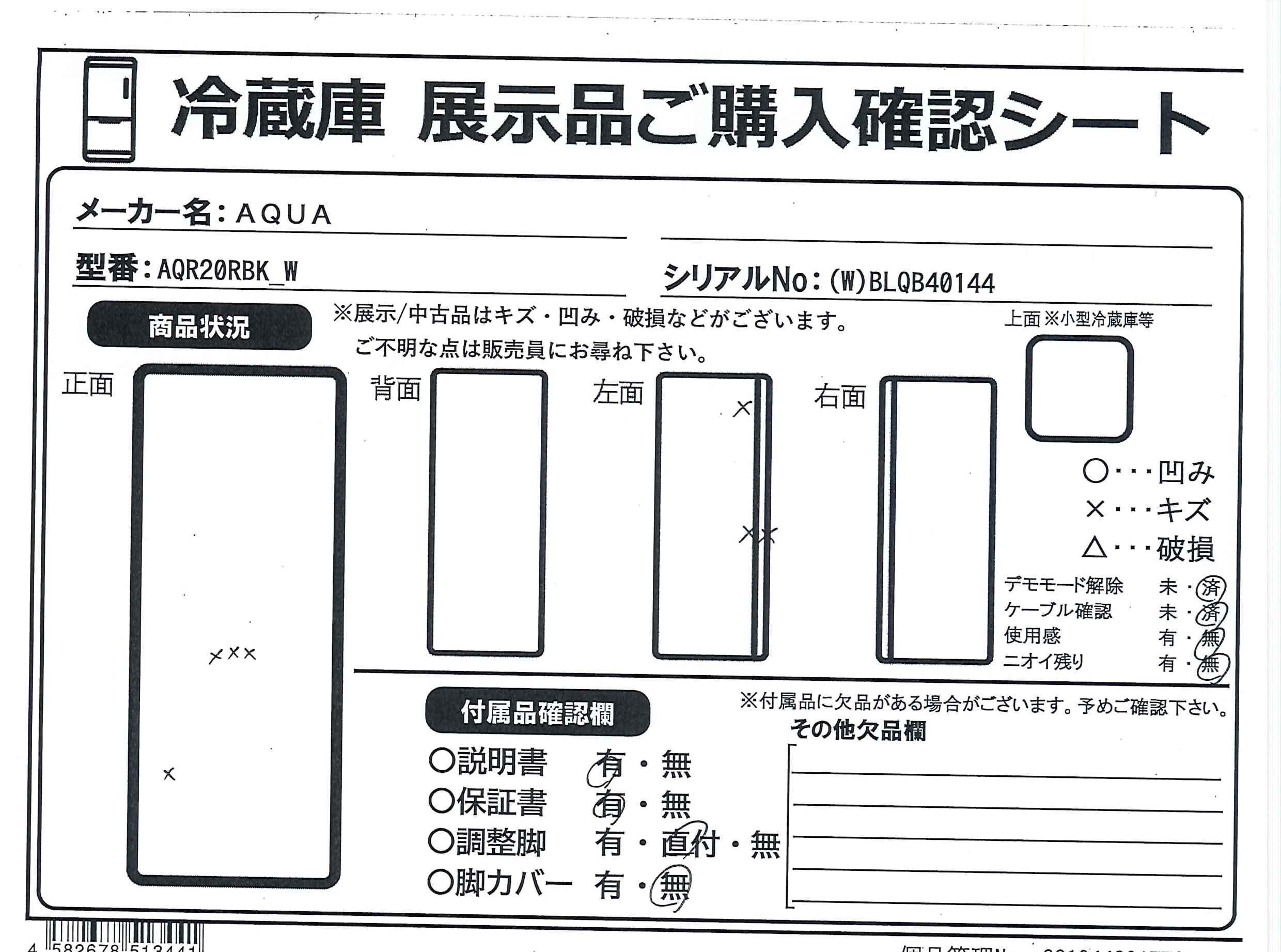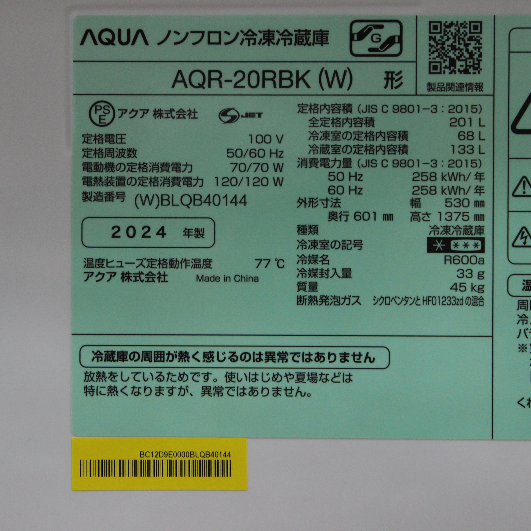 〔展示品〕 冷蔵庫 マットホワイト AQR-20RBK-W [幅53cm /201L /2ドア /右開きタイプ /2024年]