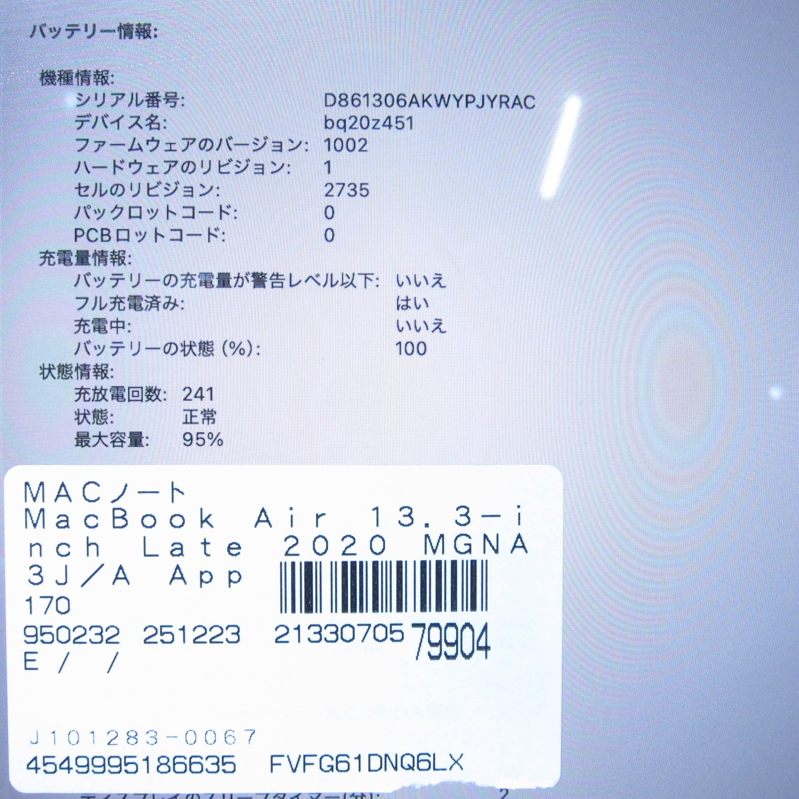 〔中古品〕 MacBook Air 13.3-inch Late-2020 MGNA3J/A Apple M1 8コアCPU_8コアGPU 16GB SSD2TB シルバー 〔26.1 Tahoe〕 [グラフィック:オンボード/JISキーボード]