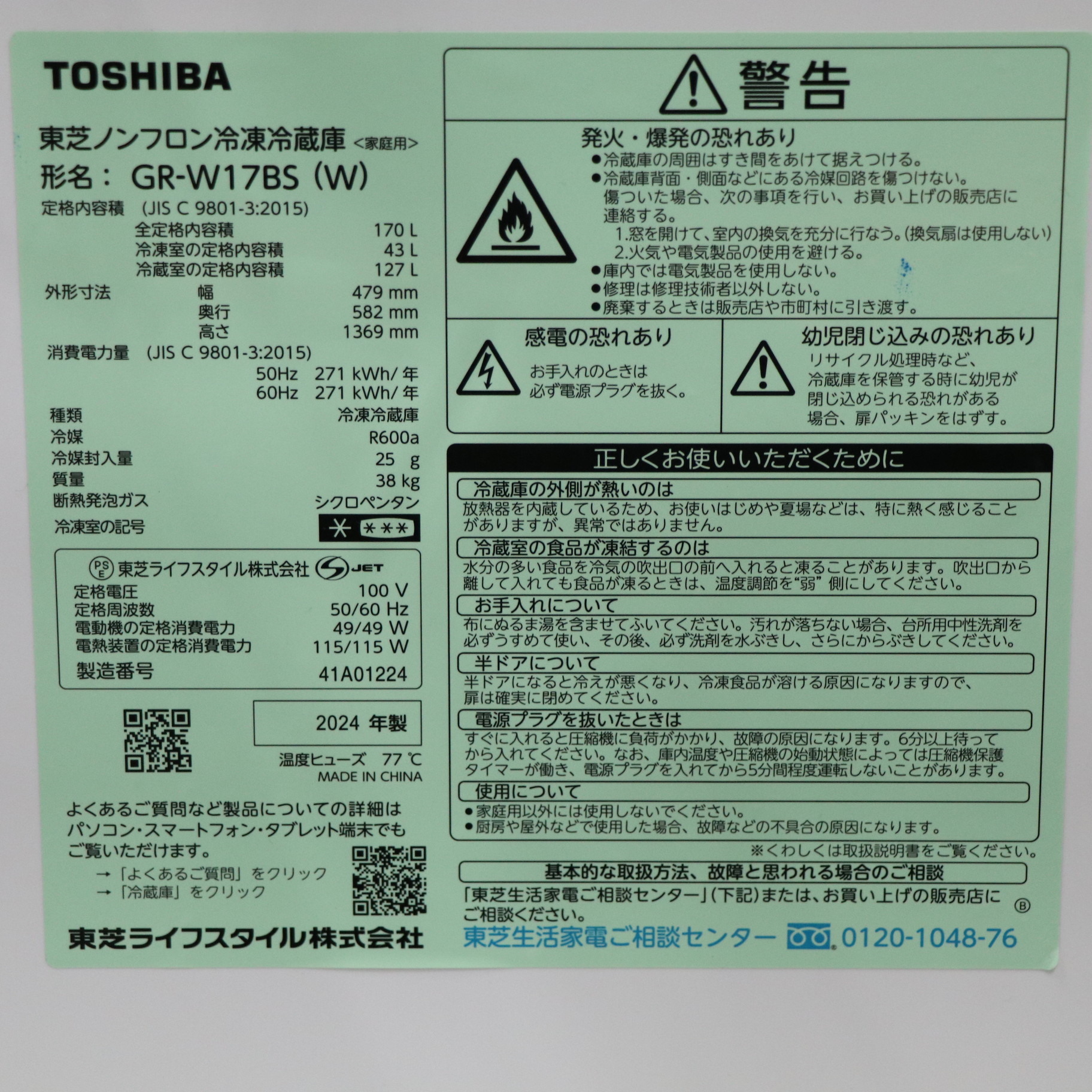 〔展示品〕 冷蔵庫 BSシリーズ セミマットホワイト GR-W17BS-W [幅47.9cm /170L /2ドア /右開きタイプ /2024年]
