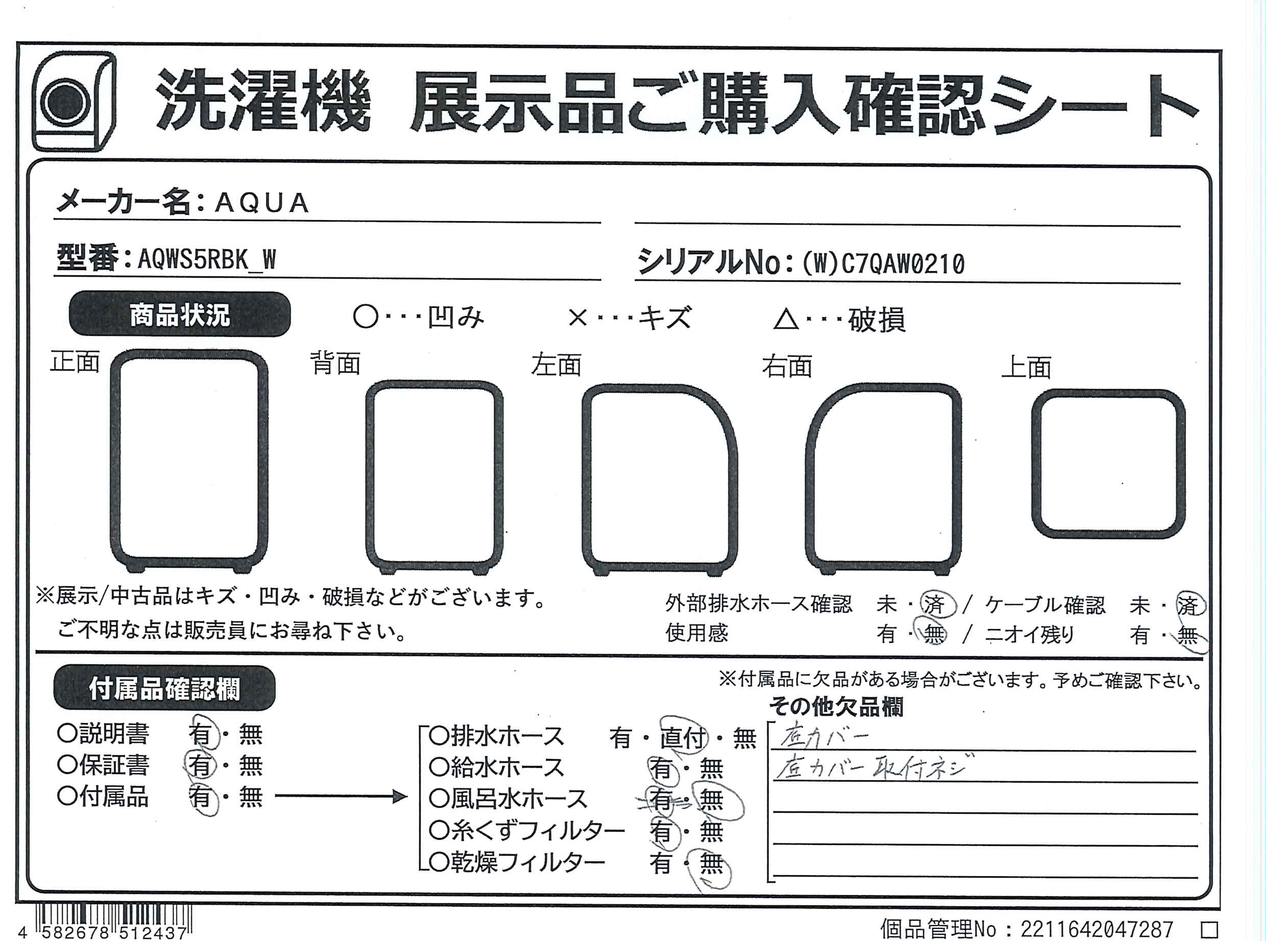 中古商品ランクについて 付属品・商品状態について 〔付属品〕説明書、据付説明書、糸くずフィルター、給水ホース、マジックつぎ手