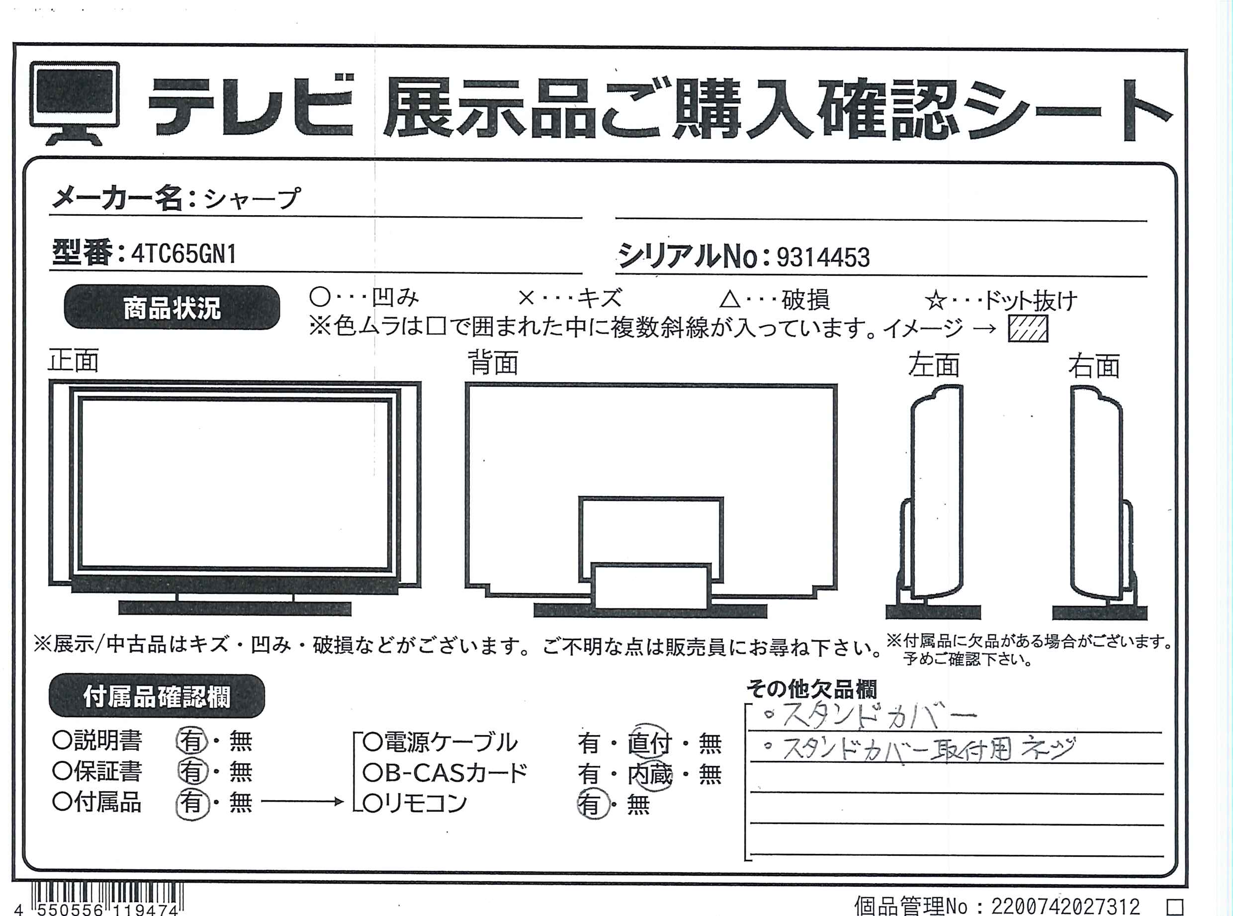 ▼同型番の新品商品はこちら![]() SHARP(シャープ) 液晶テレビ AQUOS ブラック 4T-C65GN1 [65V型 /Bluetooth対応 /4K対応 /BS・CS 4Kチューナー内蔵 /YouTube対応] ¥178,000(税込) 0ポイントサービス 在庫限り |
