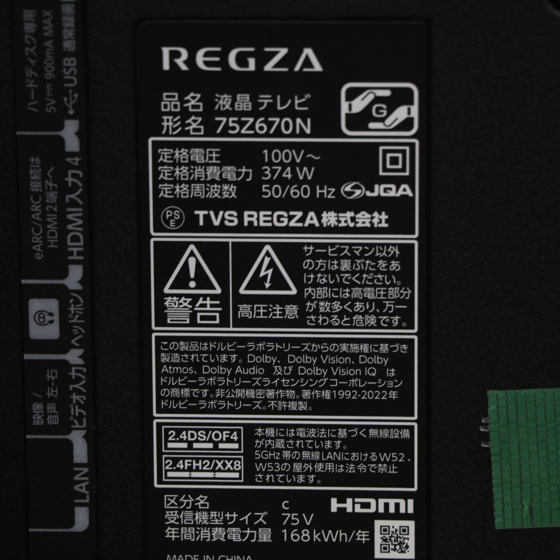 〔展示品〕 液晶テレビ REGZA(レグザ) 75Z670N [75V型 /Bluetooth対応 /4K対応 /BS・CS 4Kチューナー内蔵 /YouTube対応]