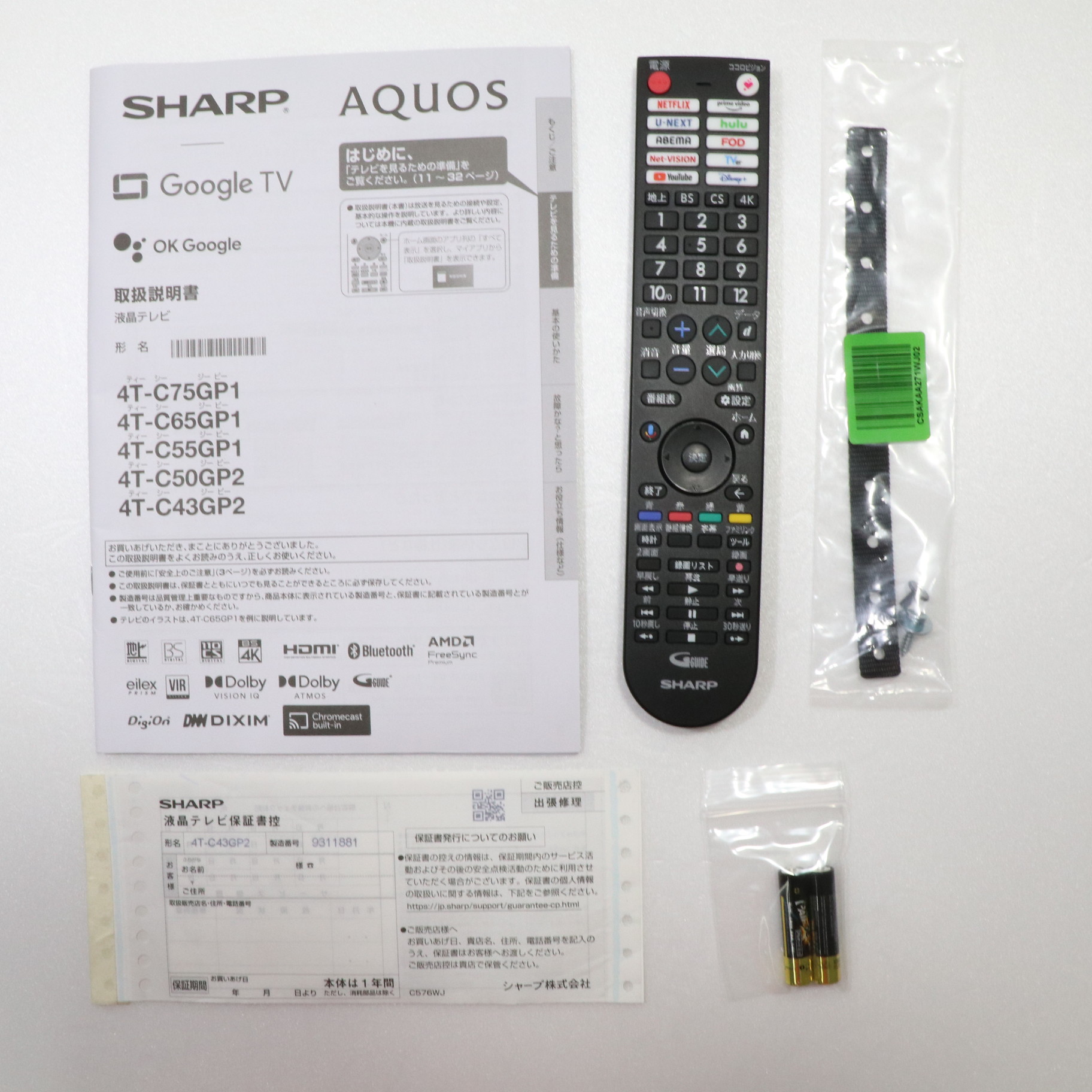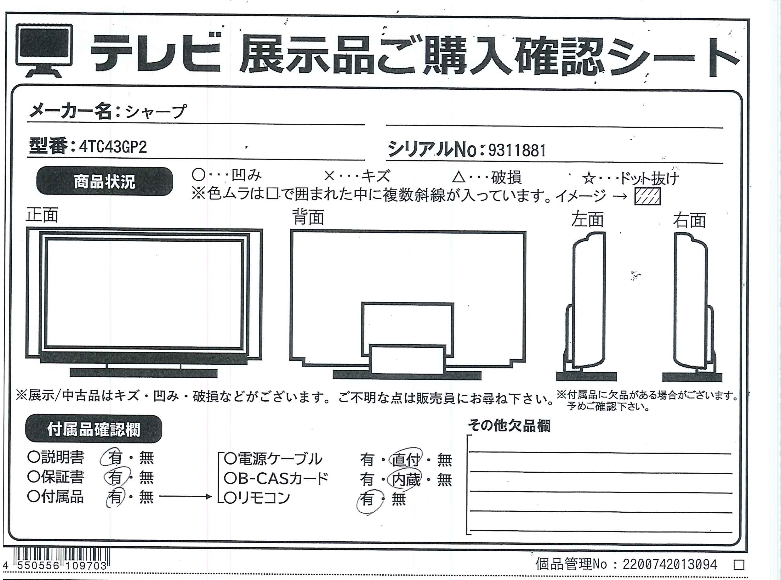 中古商品ランクについて 付属品・商品状態について 〔付属品〕説明書、スタンド取付金具、スタンドカバー、スタンドベース、スタンド取付用ネジ×4、スタンド組立用ネジ×4、転倒防止ベルト、転倒防止ベルトテレビ取付用ネジ、転倒防止ベルトテレビ台固定ネジ、スタンド回転ロックネジ、リモコン、単4形乾電池×2、かんたん使い方ガイド