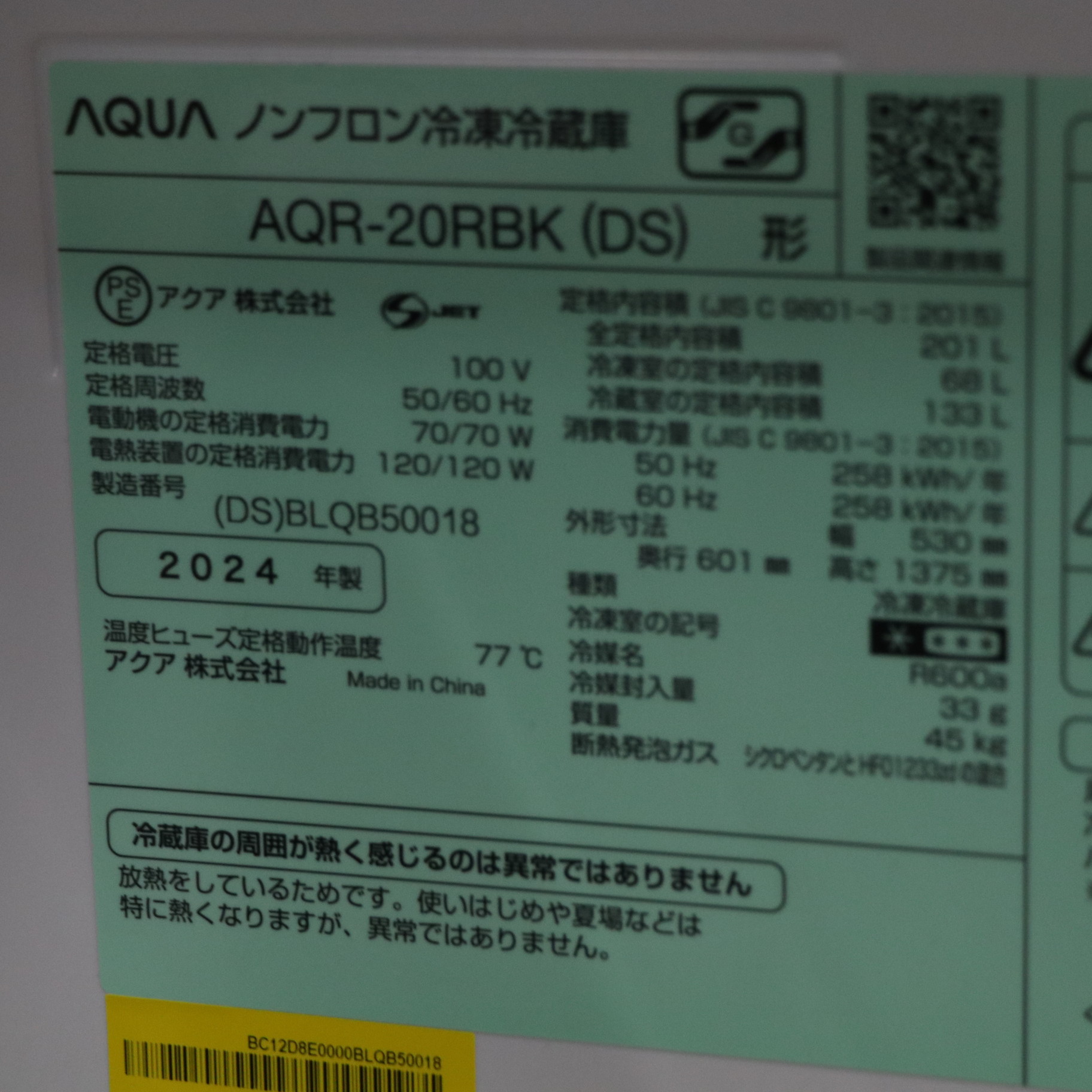 〔展示品〕 冷蔵庫 ダークシルバー AQR-20RBK-DS [幅53cm /201L /2ドア /右開きタイプ /2024年]