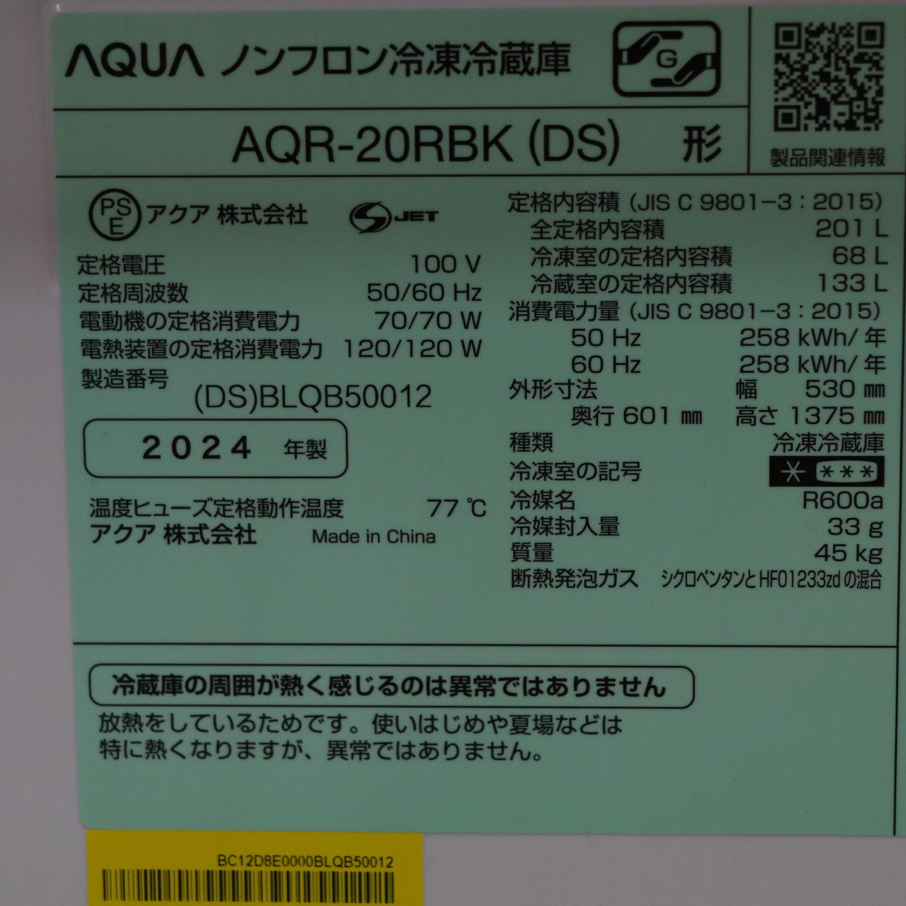 〔展示品〕 冷蔵庫 ダークシルバー AQR-20RBK-DS [幅53cm /201L /2ドア /右開きタイプ /2024年]