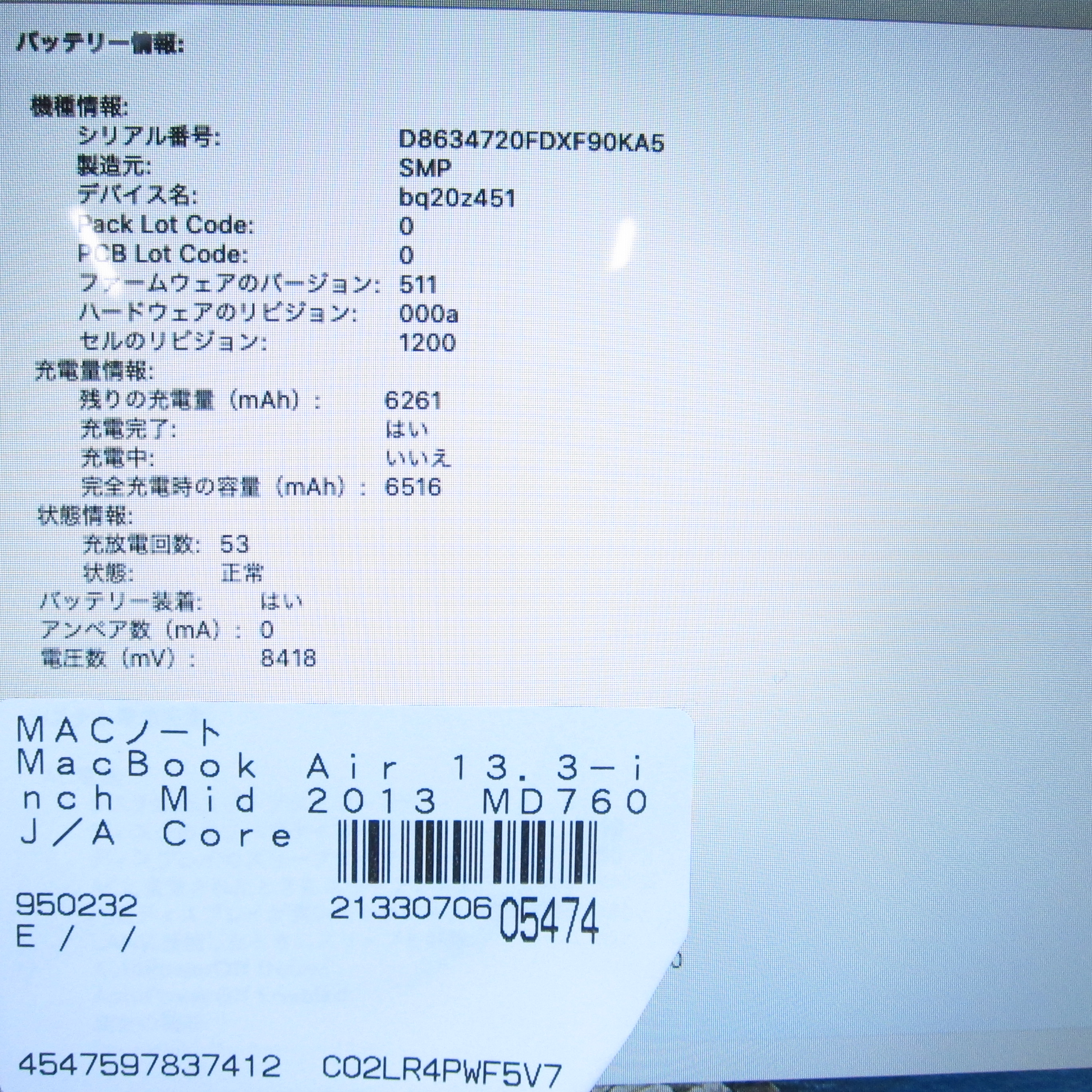 〔中古品〕 MacBook Air 13.3-inch Mid-2013 MD760J/A Core_i5 1.3GHz 4GB SSD128GB 〔10.15 Catalina〕 [グラフィック:Intel HD Graphics 5000/JISキーボード]