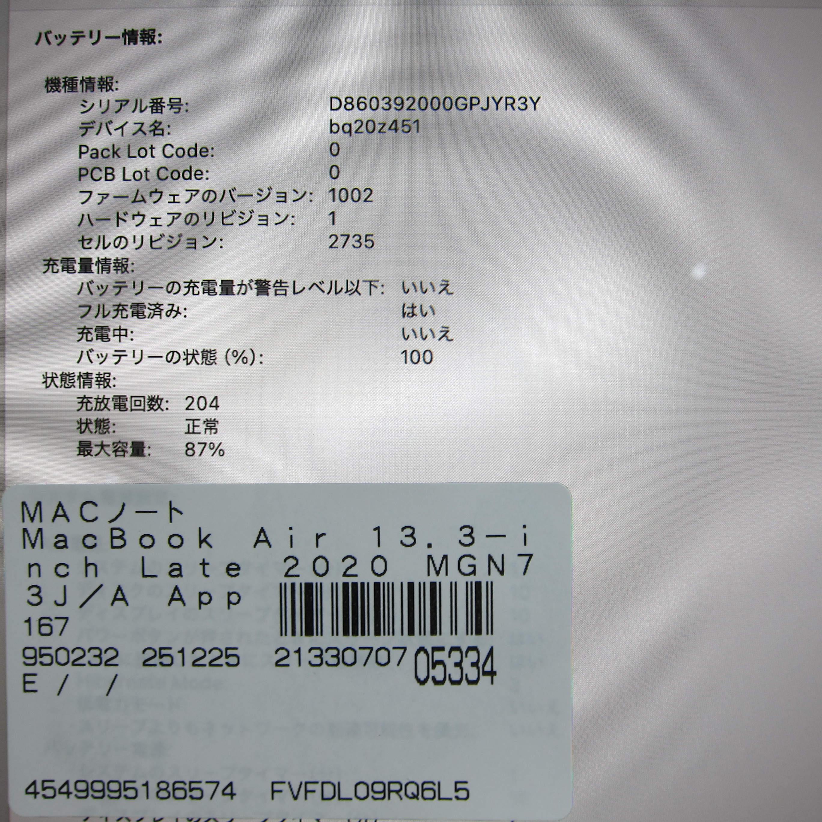 〔中古品〕 MacBook Air 13.3-inch Late-2020 MGN73J/A Apple M1 8コアCPU_8コアGPU 8GB SSD512GB スペースグレイ 〔15.3 Sequoia〕 [グラフィック:オンボード/JISキーボード]