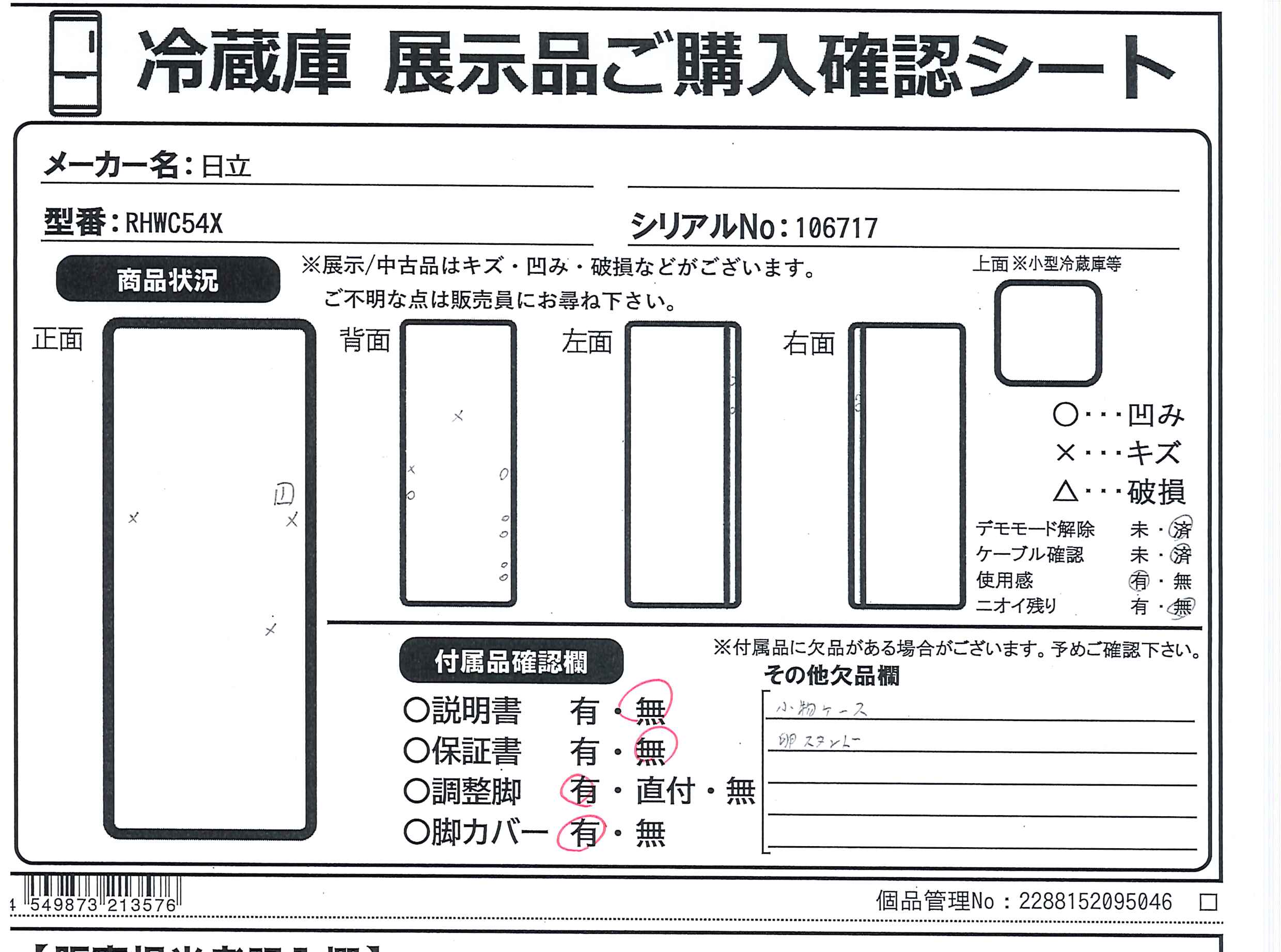 中古商品ランクについて 付属品・商品状態について 〔付属品〕脚カバー、調節脚×2、クッション×2、給水タンク一式、製氷スコップ、大型アルミトレイ