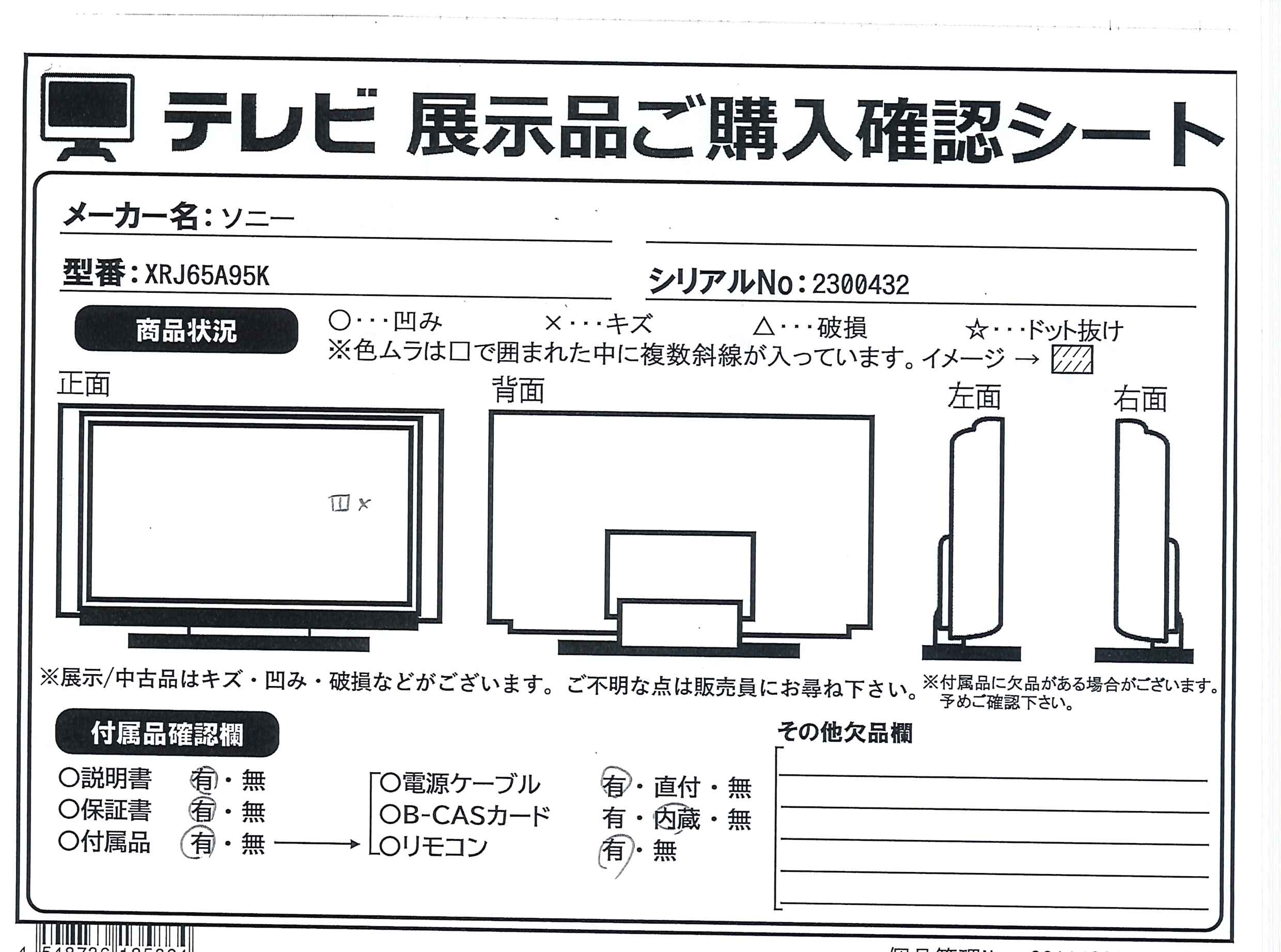 中古商品ランクについて 付属品・商品状態について 〔付属品〕取扱説明書、組み立て/設置ガイド、スタンド取付金具カバー(CN1)、スタンド取付金具カバー(CN2)、台座カバー(CD1)、台座カバー(CD2)、スタンド取付金具(SN)×2、リモコン、背面パネル(CC)、背面パネル(CB)、背面パネル(CA)、背面パネル(KB)、カメラ(KA)、ケーブルクランプ、電源ケーブル、スタンド用ネジ(M5L14)×8、単四型乾電池×2、転倒防止用ベルト一式(FB)、台座(SB)