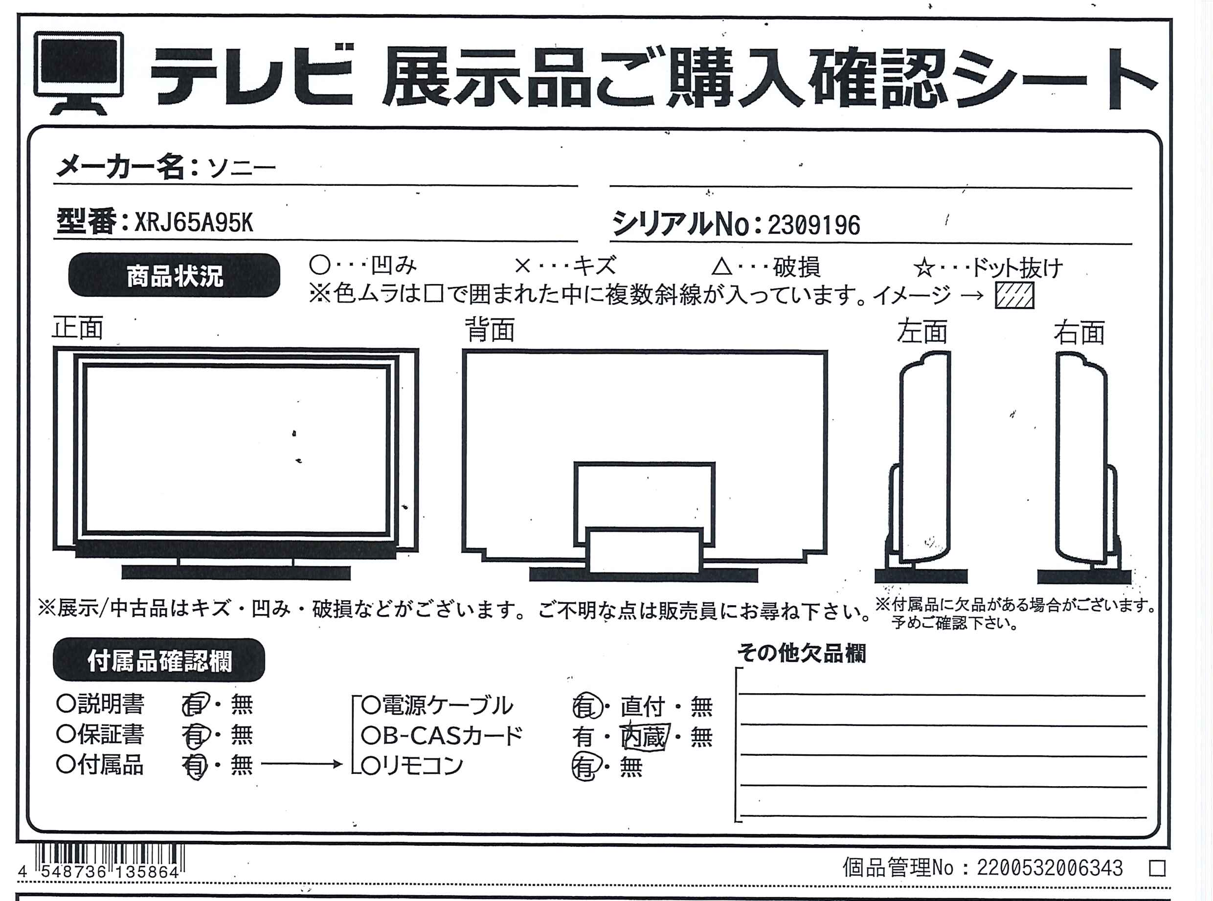 中古商品ランクについて 付属品・商品状態について 〔付属品〕取扱説明書、組み立て/設置ガイド、スタンド取付金具カバー(CN1)、スタンド取付金具カバー(CN2)、台座カバー(CD1)、台座カバー(CD2)、スタンド取付金具(SN)×2、リモコン、背面パネル(CC)、背面パネル(CB)、背面パネル(CA)、背面パネル(KB)、カメラ(KA)、ケーブルクランプ、電源ケーブル、スタンド用ネジ(M5L14)×8、単四型乾電池×2、転倒防止用ベルト一式(FB)、台座(SB)