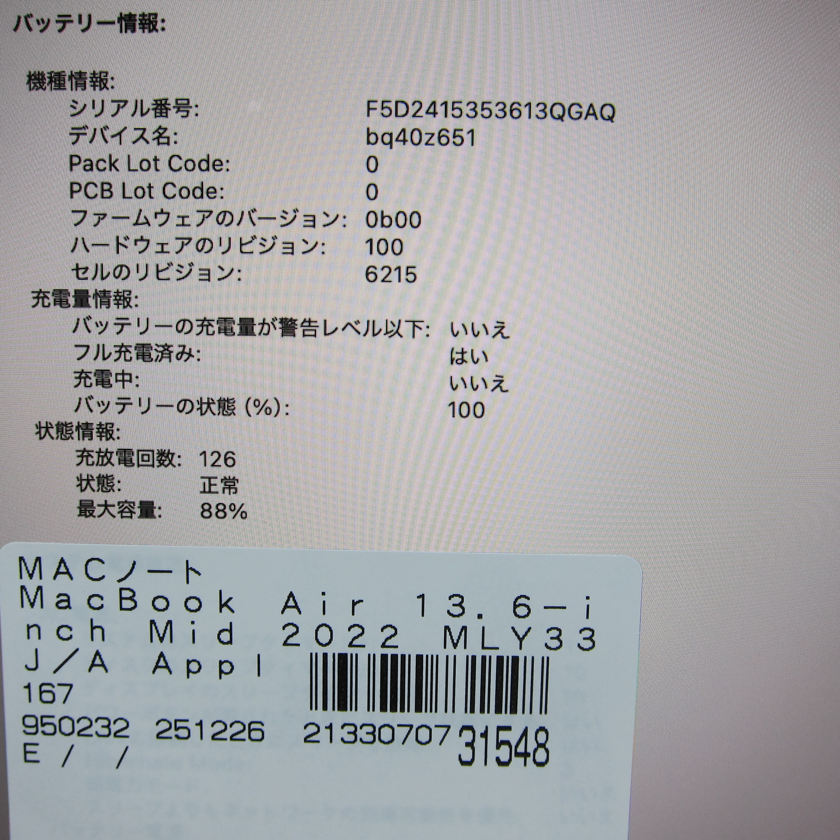 〔中古品〕 MacBook Air 13.6-inch Mid-2022 MLY33J/A Apple M2 8コアCPU_8コアGPU 16GB SSD256GB ミッドナイト 〔15.7 Sequoia〕 [グラフィック:オンボード/JISキーボード]