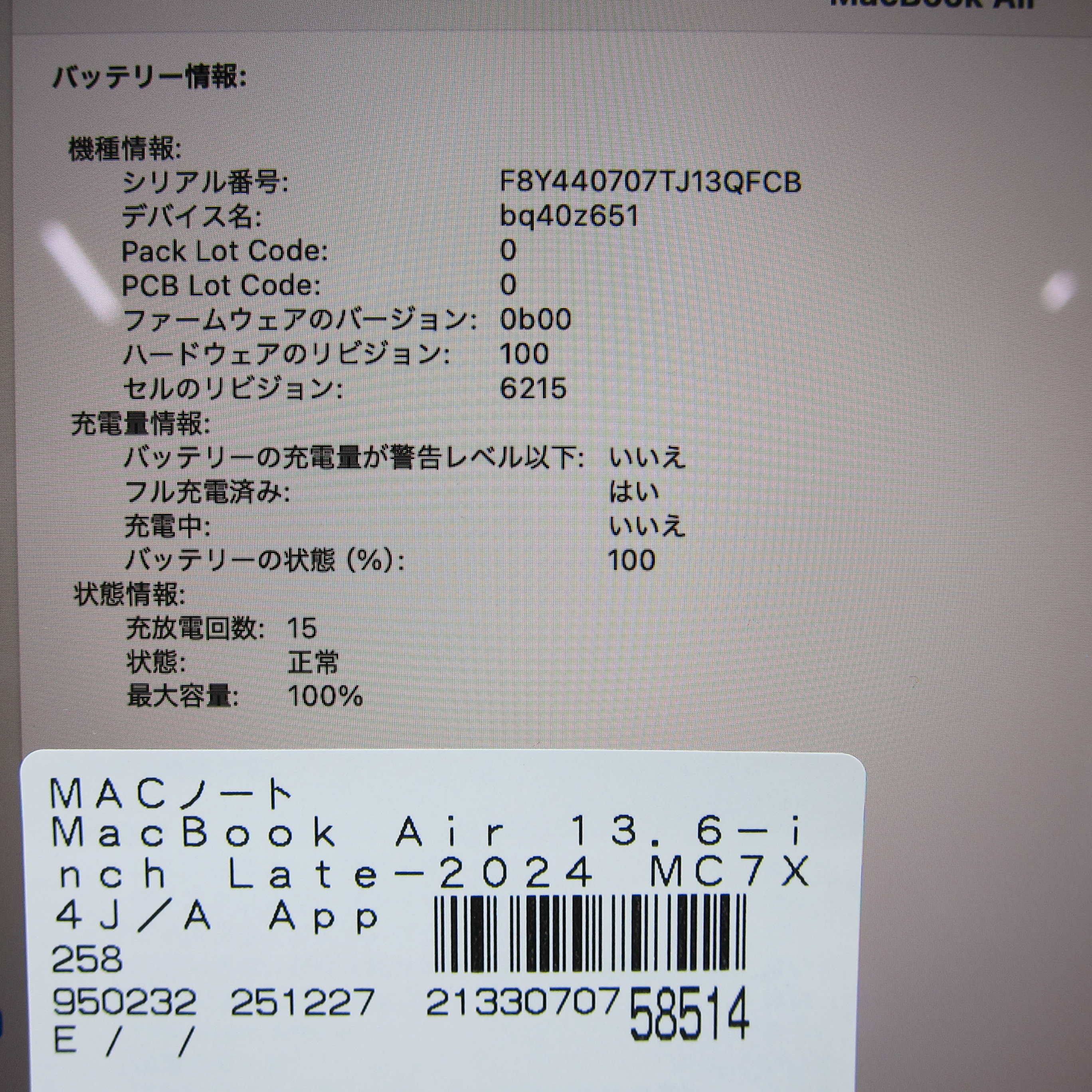 〔中古品〕 MacBook Air 13.6-inch Late-2024 MC7X4J/A Apple M2 8コアCPU_8コアGPU 16GB SSD256GB ミッドナイト 〔15.3 Sequoia〕 [グラフィック:オンボード/JISキーボード]