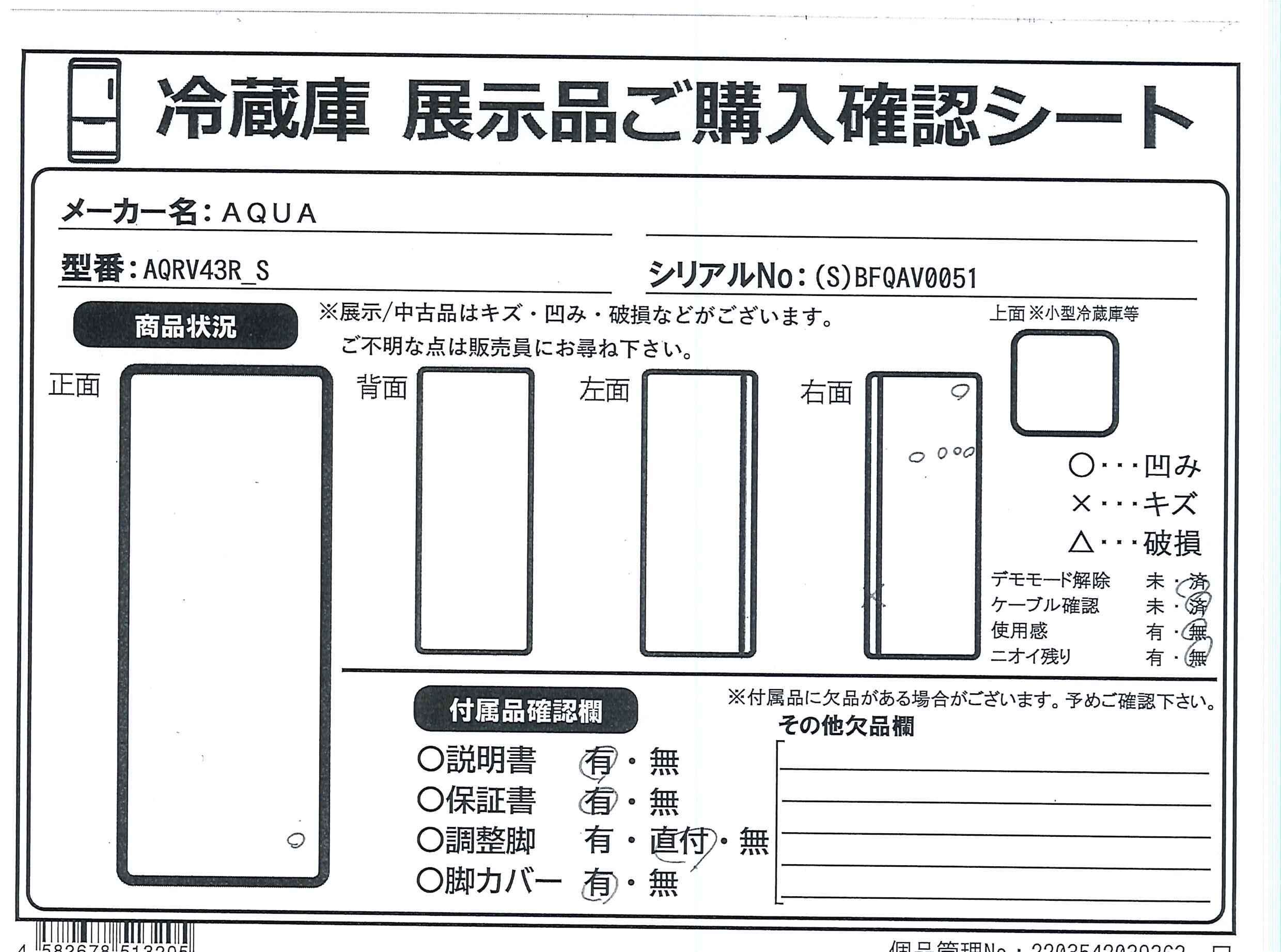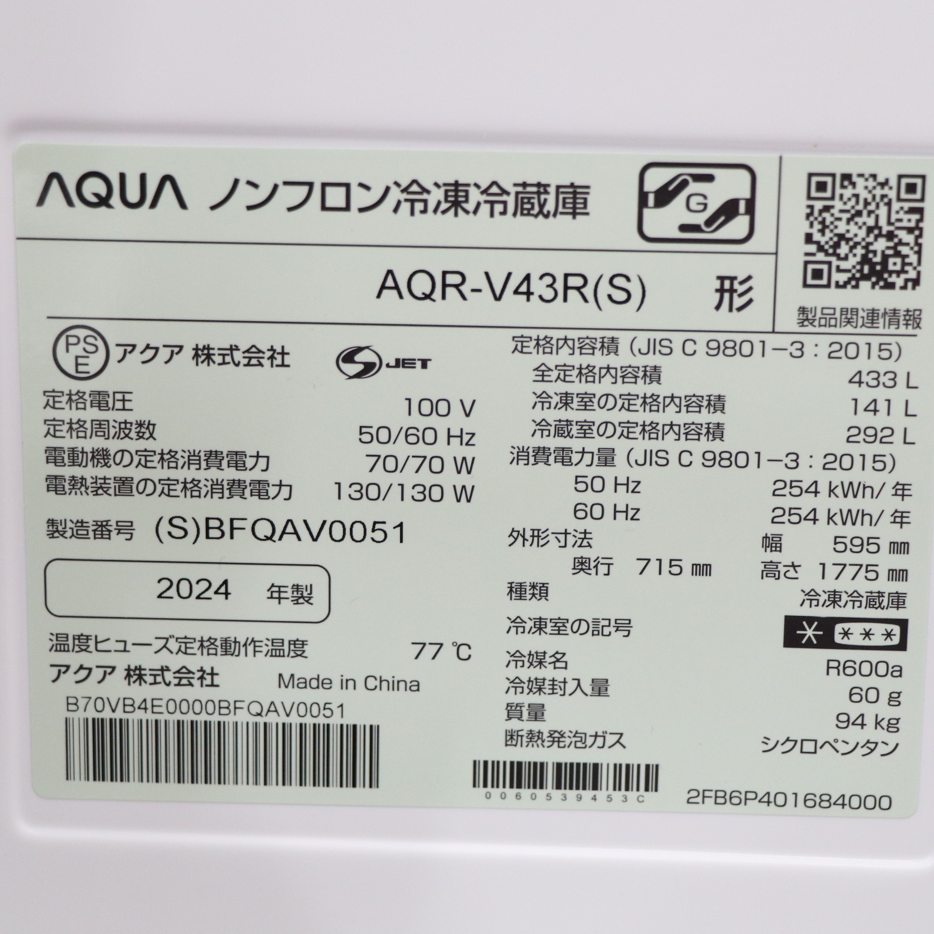 〔展示品〕 冷蔵庫 DELIE Plus(デリエプラス)シリーズ チタンシルバー AQR-V43R-S [幅59.5cm /433L /4ドア /右開きタイプ /2024年]