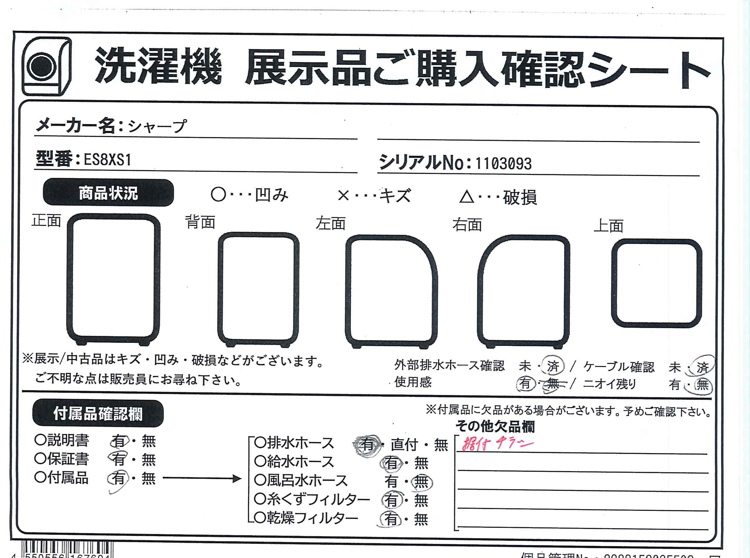 中古商品ランクについて 付属品・商品状態について 〔付属品〕説明書、クラウドサービスガイド、洗剤ご使用ガイド、給水ホース、潜水つぎ手、外部排水ホース、ホースクリップ、水準器、輸送用固定ねじ×4、ボトルキャップ
