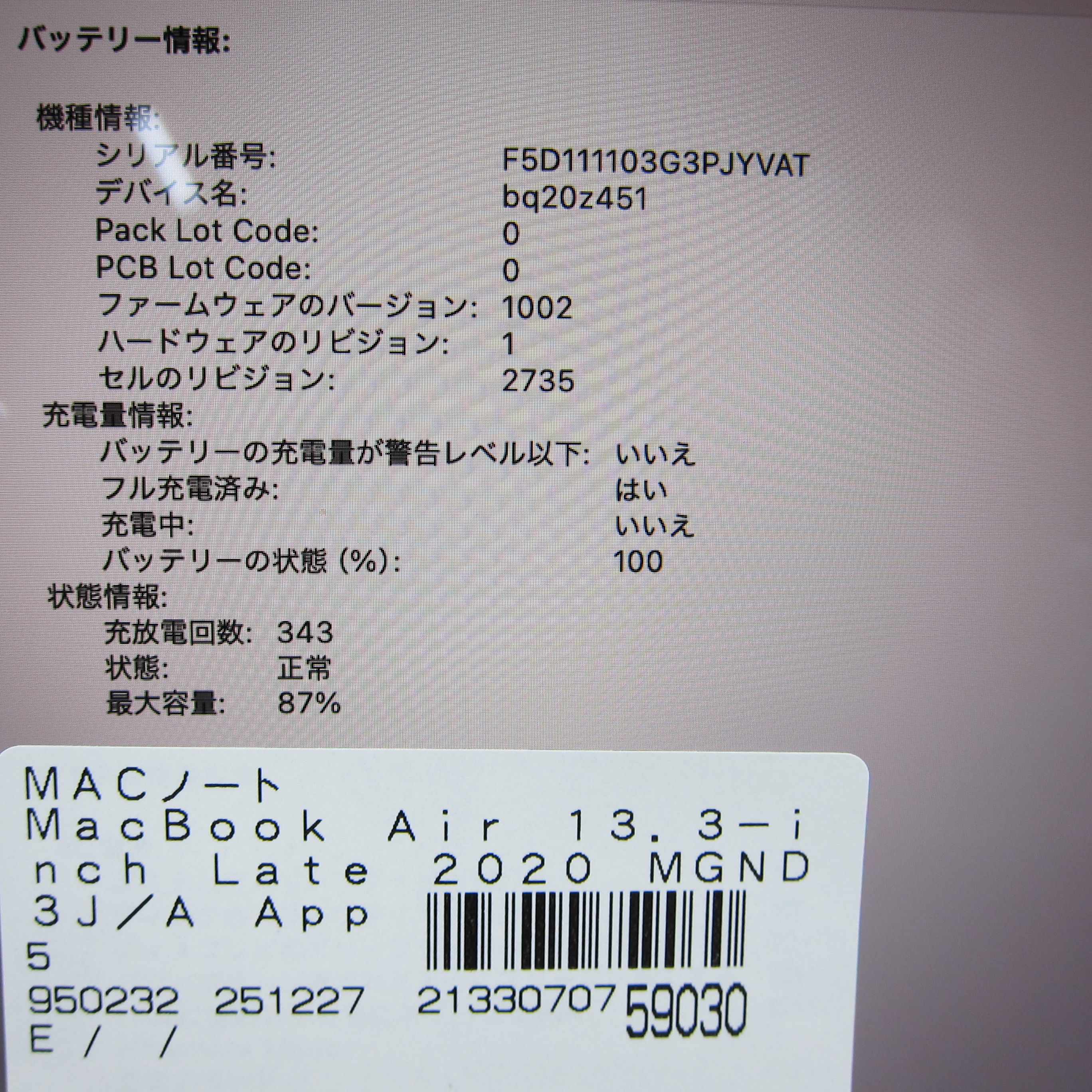 〔中古品〕 MacBook Air 13.3-inch Late-2020 MGND3J/A Apple M1 8コアCPU_7コアGPU 8GB SSD256GB ゴールド 〔15.7 Sequoia〕 [グラフィック:オンボード/JISキーボード]
