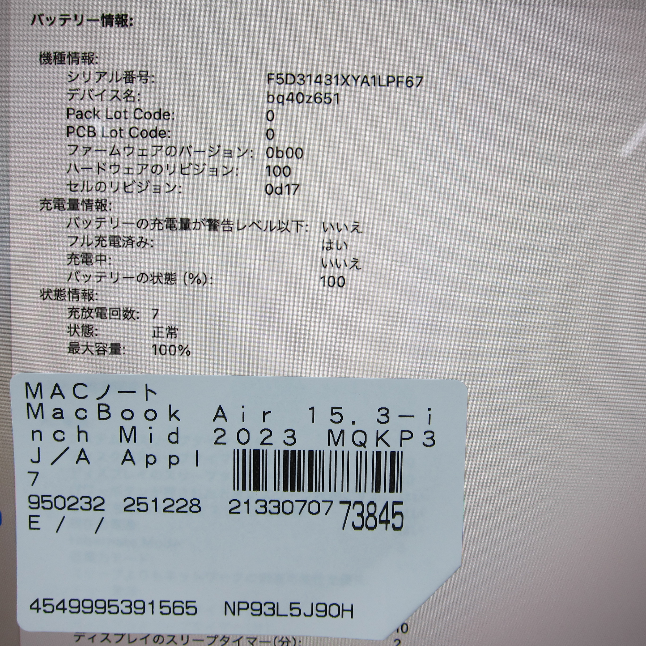 〔中古品〕 MacBook Air 15.3-inch Mid-2023 MQKP3J/A Apple M2 8コアCPU_10コアGPU 8GB SSD256GB スペースグレイ 〔14.7 Sonoma〕 [グラフィック:オンボード/JISキーボード]
