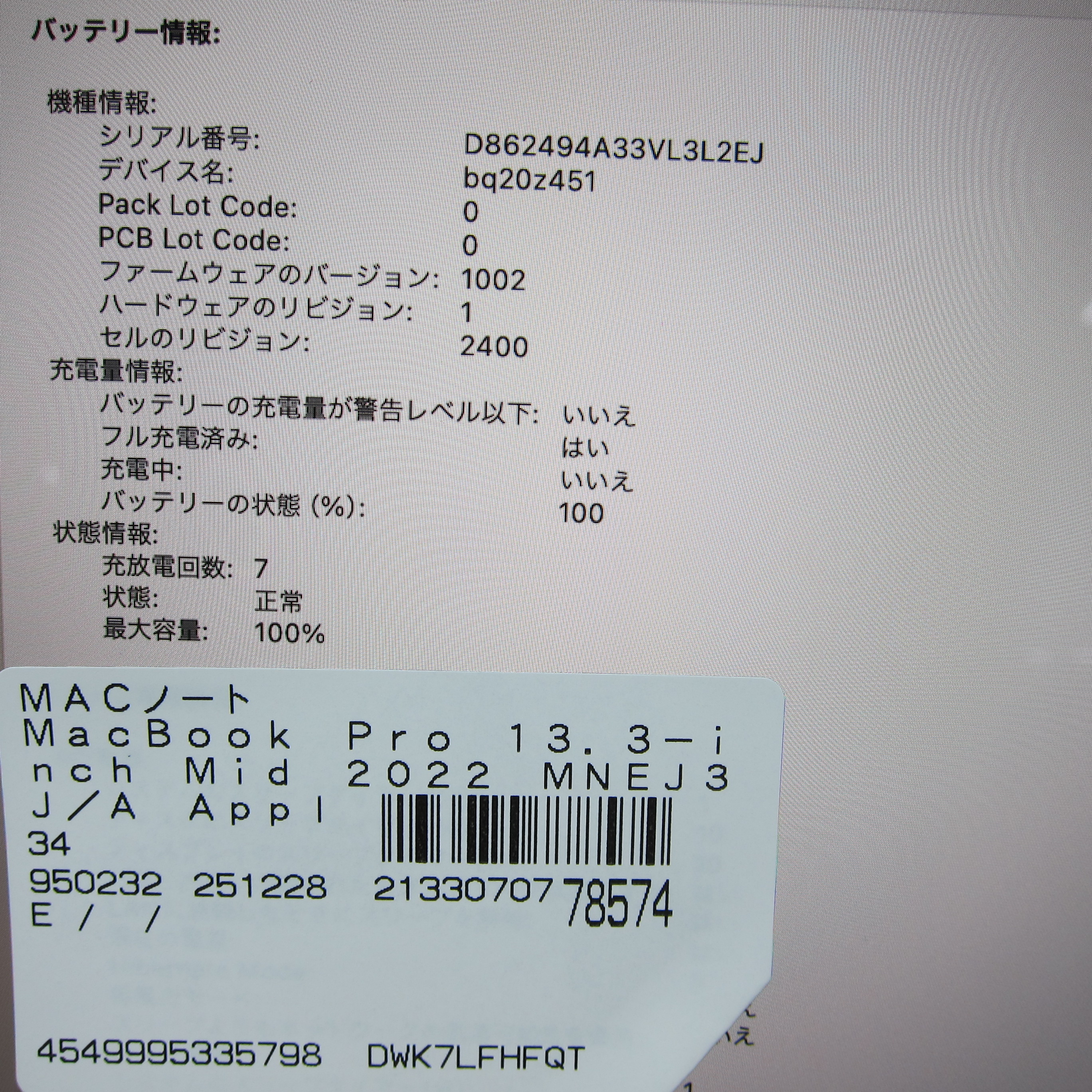 〔中古品〕 MacBook Pro 13.3-inch Mid-2022 MNEJ3J/A Apple M2 8コアCPU_10コアGPU 24GB SSD512GB スペースグレイ 〔14.7 Sonoma〕 [グラフィック:オンボード/JISキーボード]