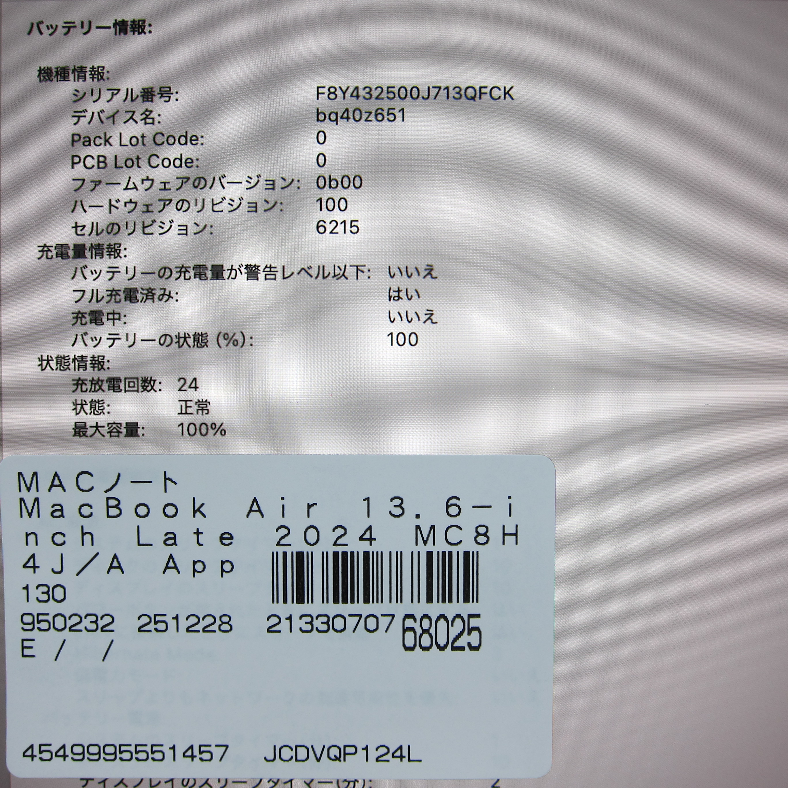 〔中古品〕 MacBook Air 13.6-inch Late-2024 MC8H4J/A Apple M3 8コアCPU_8コアGPU 16GB SSD256GB シルバー 〔15.7 Sequoia〕 [グラフィック:オンボード/JISキーボード]
