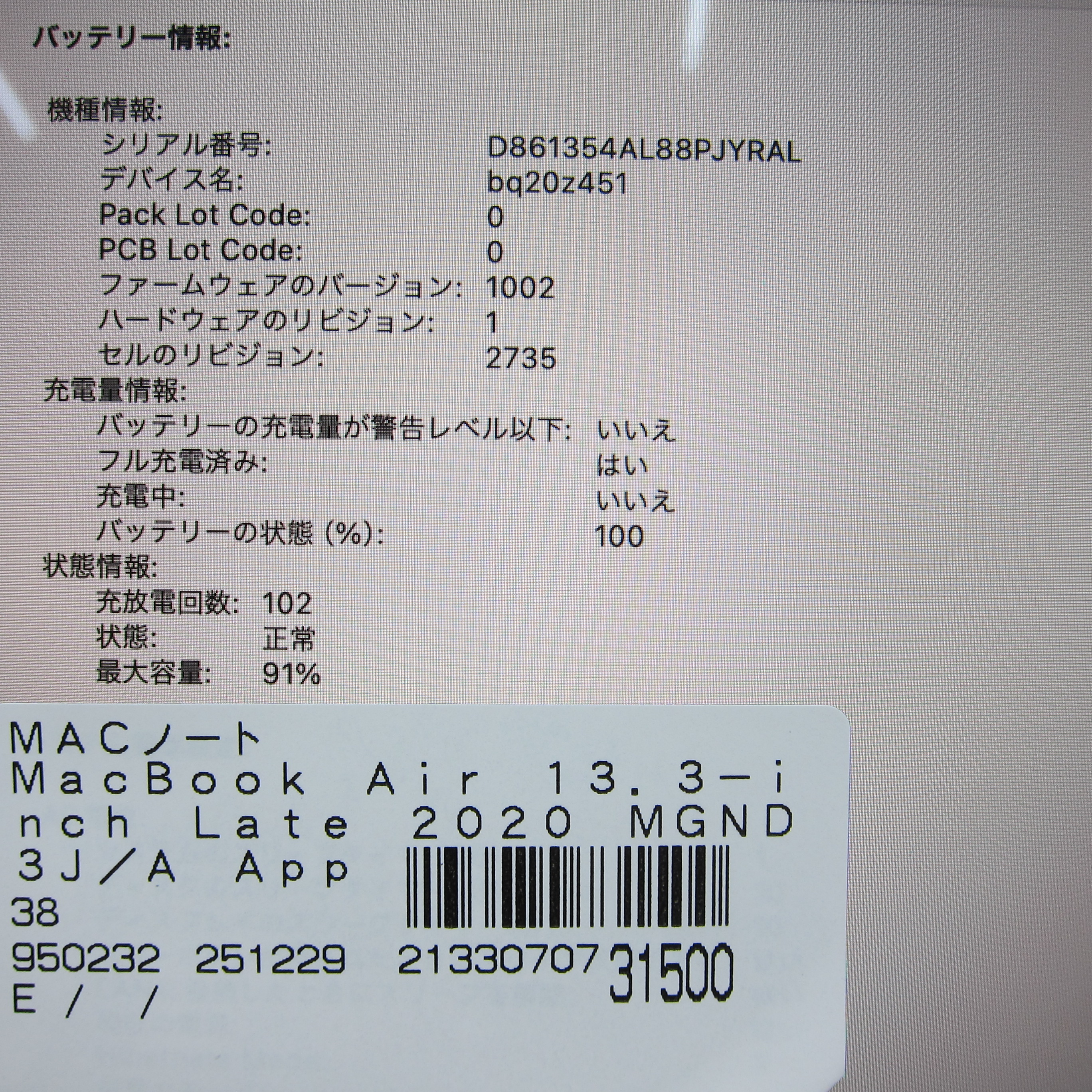 〔中古品〕 MacBook Air 13.3-inch Late-2020 MGND3J/A Apple M1 8コアCPU_7コアGPU 8GB SSD256GB ゴールド 〔14.7 Sonoma〕 [グラフィック:オンボード/JISキーボード]