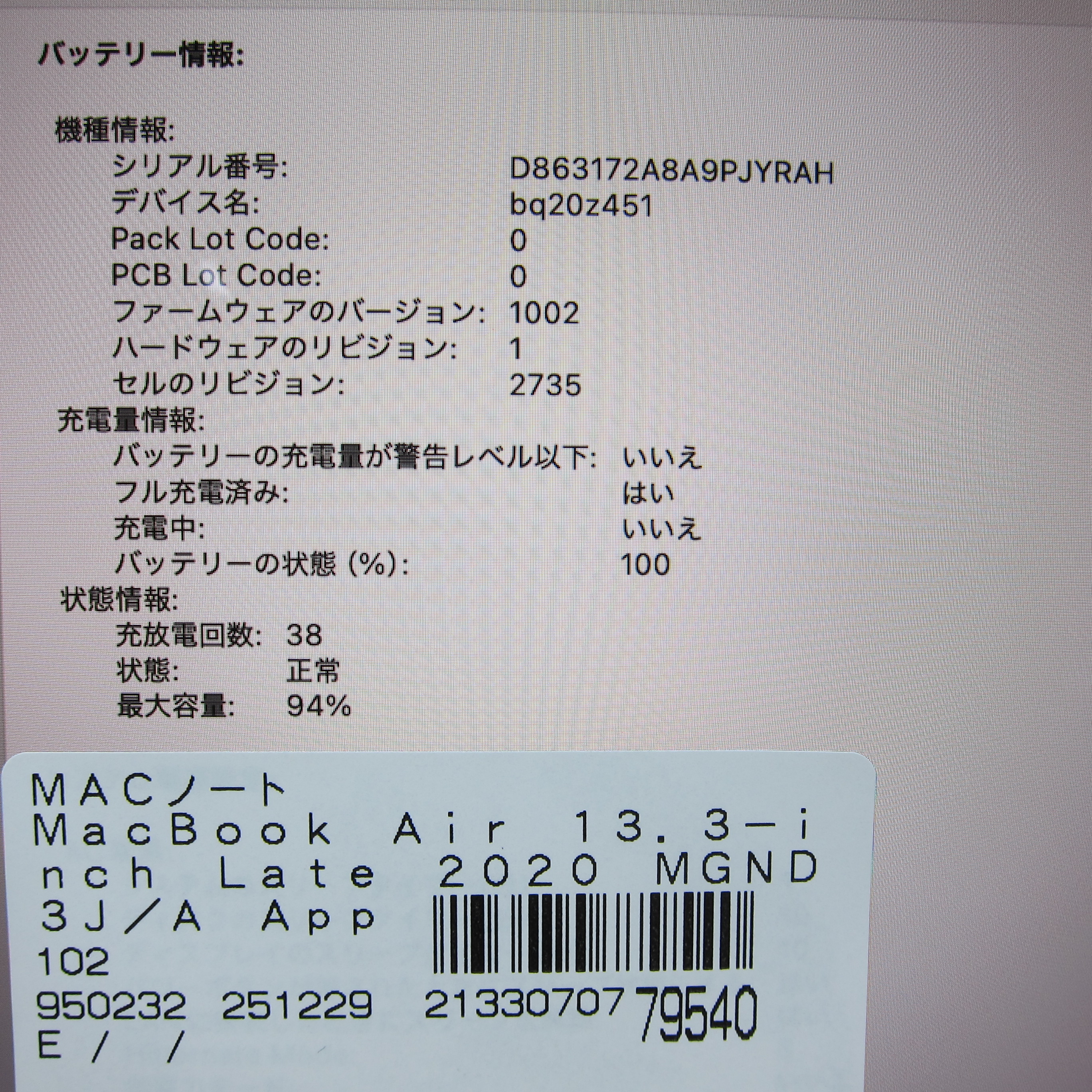 〔中古品〕 MacBook Air 13.3-inch Late-2020 MGND3J/A Apple M1 8コアCPU_7コアGPU 8GB SSD256GB ゴールド 〔15.7 Sequoia〕 [グラフィック:オンボード/JISキーボード]