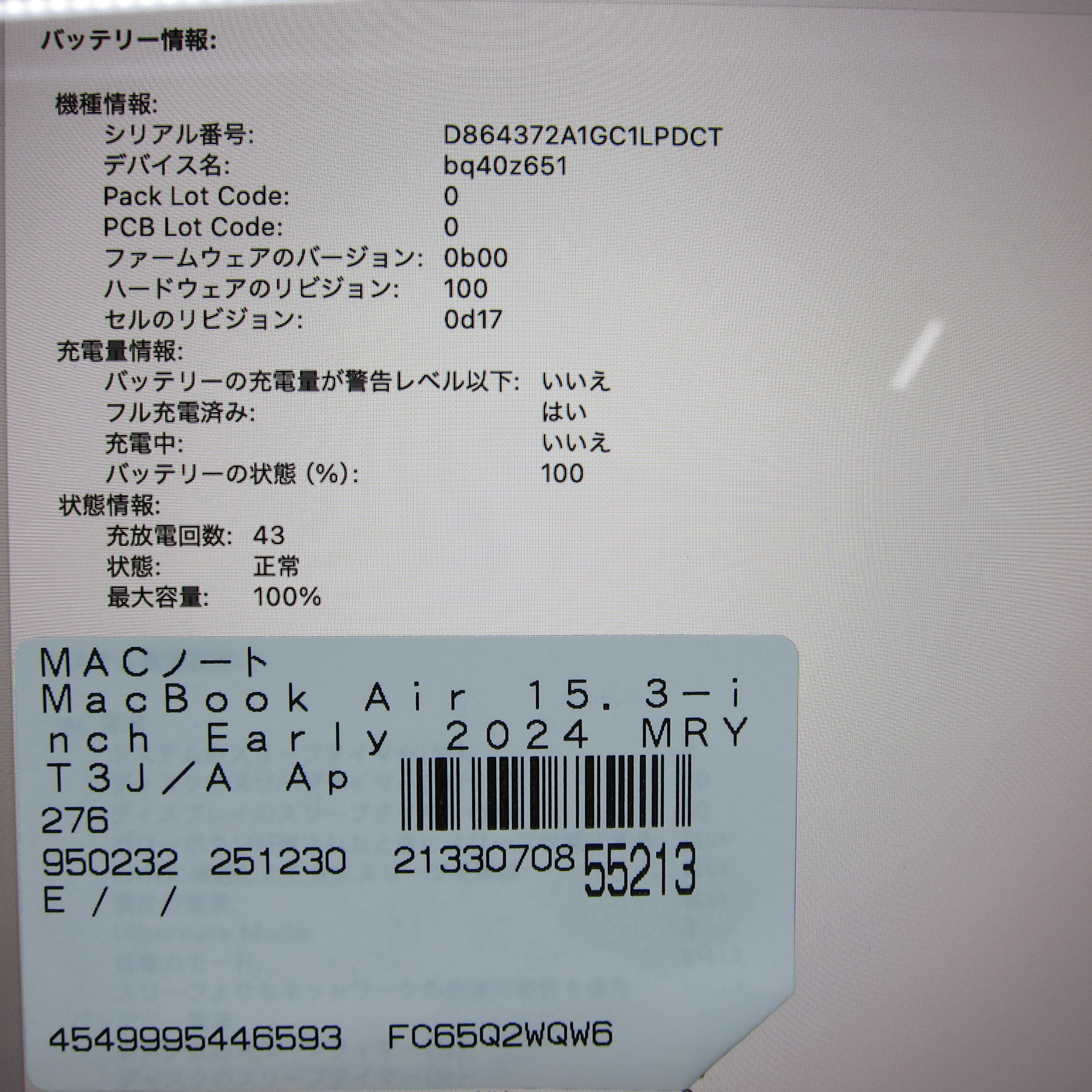〔中古品〕 MacBook Air 15.3-inch Early-2024 MRYT3J/A Apple M3 8コアCPU_10コアGPU 8GB SSD512GB スターライト 〔15.7 Sequoia〕 [グラフィック:オンボード/JISキーボード]