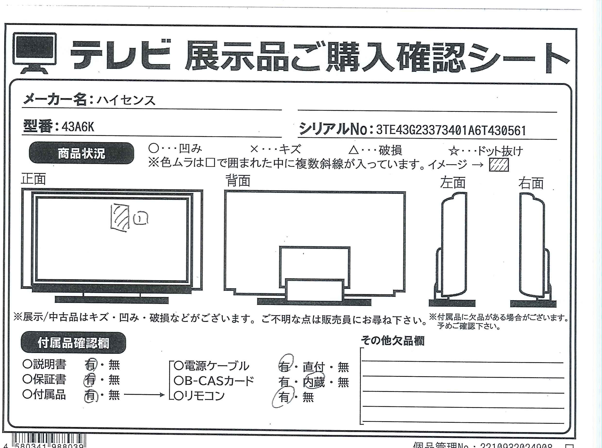 中古商品ランクについて 付属品・商品状態について 〔付属品〕説明書、電源コード、単三型乾電池×2、リモコン、転倒防止ベルト一式、スタンド×2、ネジ×4