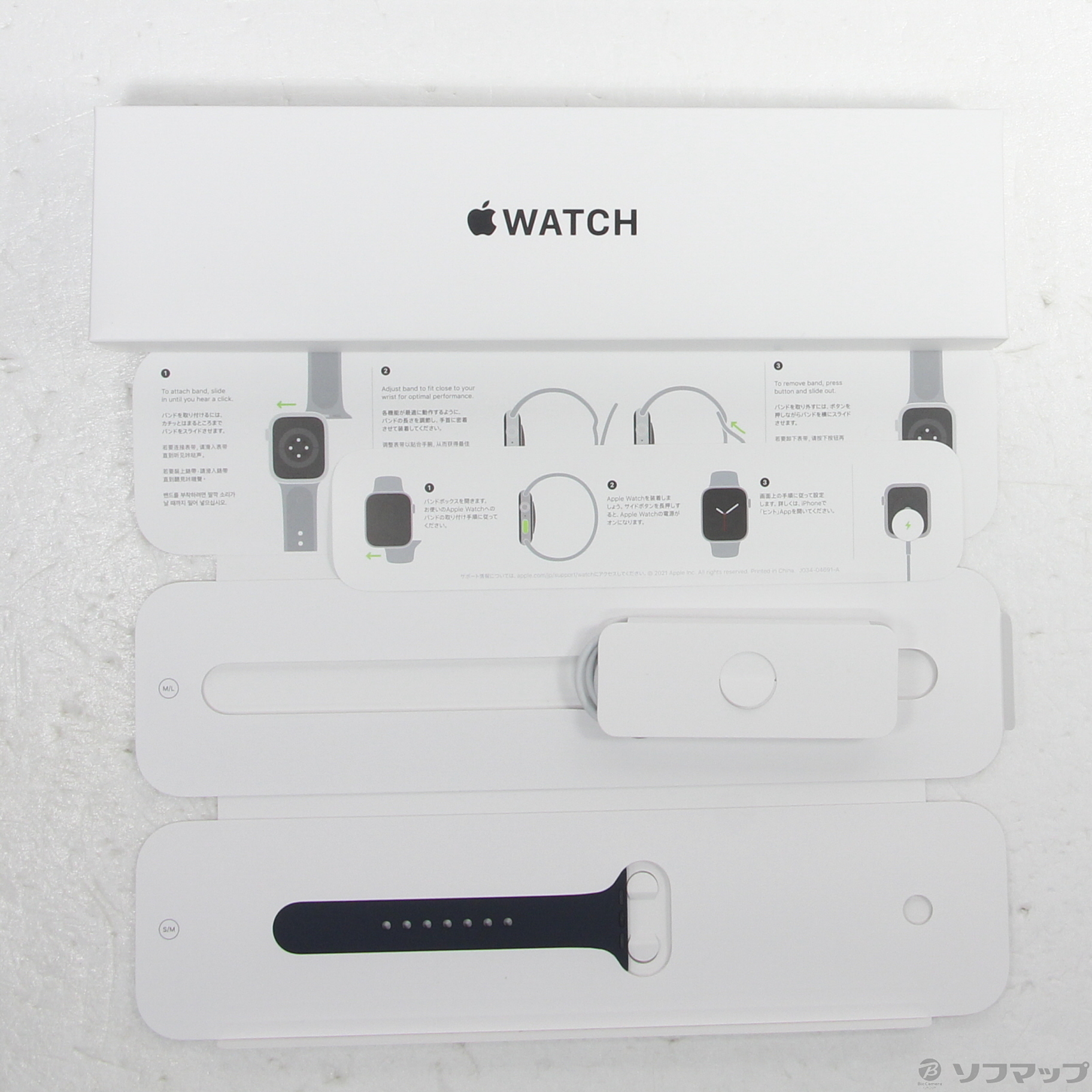 〔付属品〕外箱、説明書、ミッドナイトスポーツバンド(S/M)、ミッドナイトスポーツバンド(M/L)、磁気充電 - USBケーブル