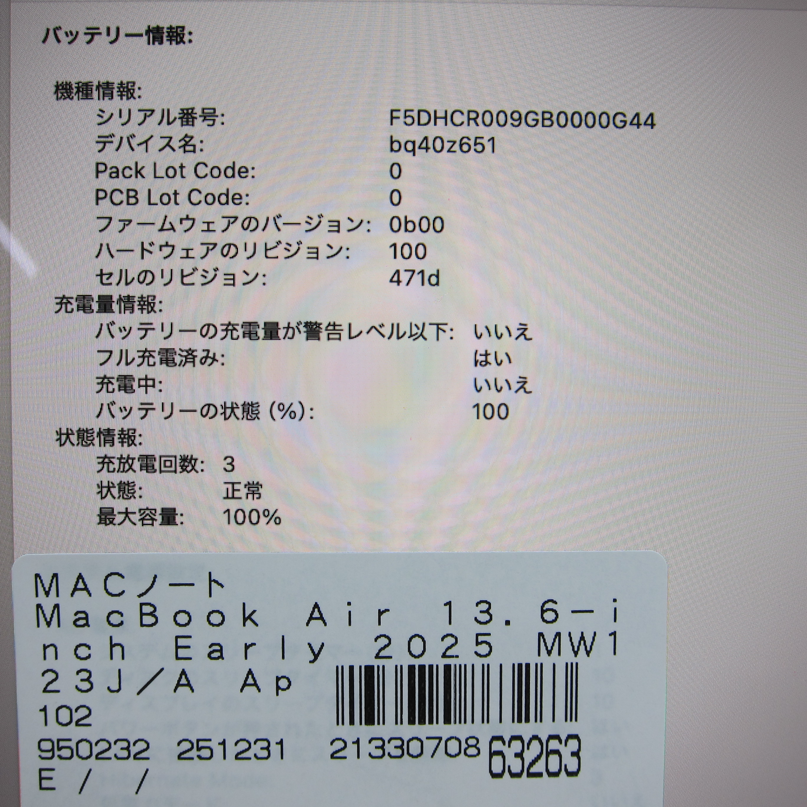 〔中古品〕 MacBook Air 13.6-inch Early-2025 MW123J/A Apple M4 10コアCPU_8コアGPU 16GB SSD256GB ミッドナイト 〔15.7 Sequoia〕 [グラフィック:オンボード/JISキーボード]