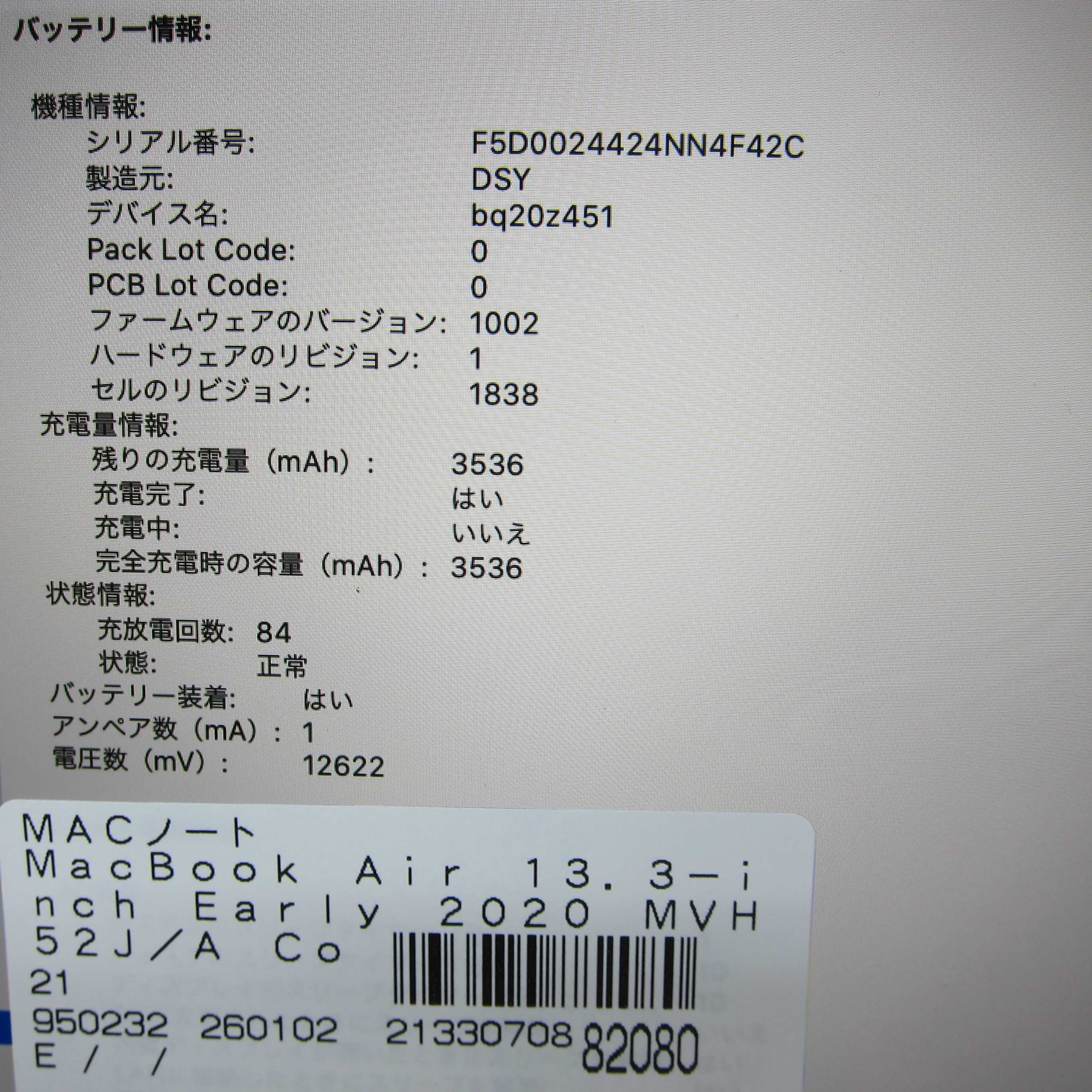 商品名 〔中古品〕 MacBook Air 13.3-inch Early-2020 MVH52J/A Core_i5 1.1GHz 8GB SSD512GB ゴールド 〔10.15 Catalina〕 [グラフィック:Intel Iris Plus Graphics/JISキーボード]