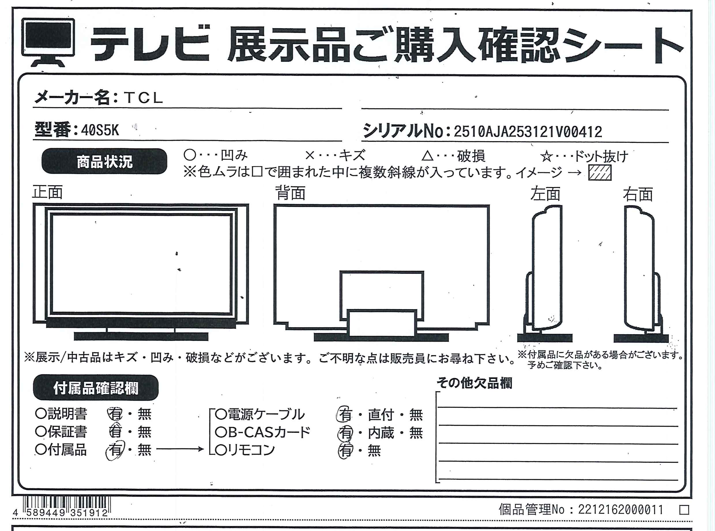 中古商品ランクについて 付属品・商品状態について 〔付属品〕説明書、かんたんガイド、リモコン、単四形乾電池×2、miniB-CASカード、電源コード、アダプター、スタンド、ネジ(ST4)(25mm)×4、転倒防止用部品一式