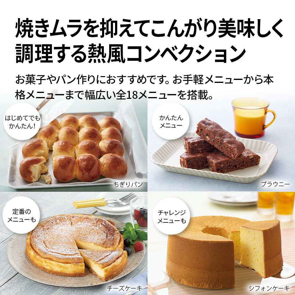 庫内全体に効率よく熱風を循環し、焼きムラを抑えてこんがりおいしく調理。お菓子やパン作りにおすすめです。