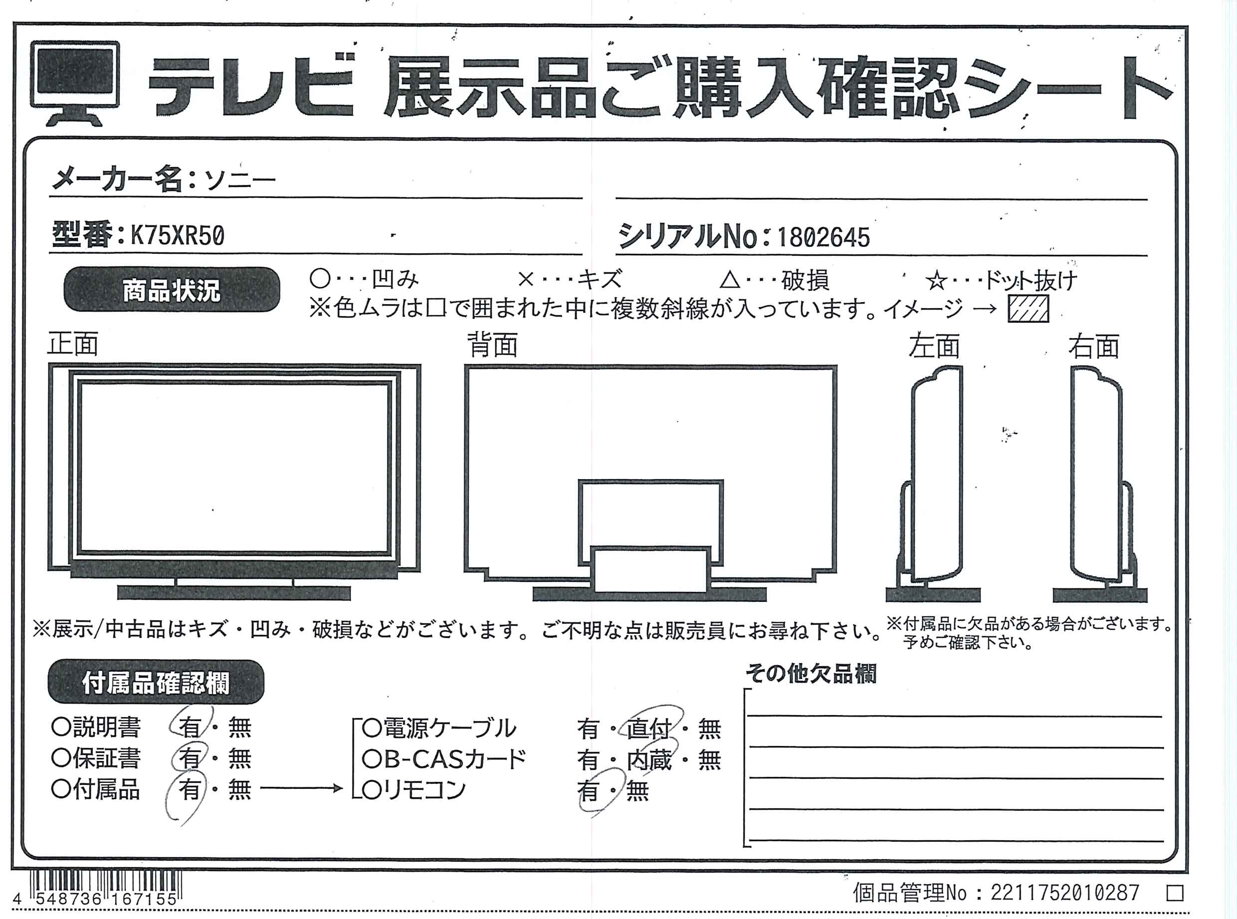 中古商品ランクについて 付属品・商品状態について 〔付属品〕取扱説明書、リモコン、単四形乾電池×2、スタンド×2、転倒防止バンド一式、スペーサー×4、ねじ(M6L12)×4、組み立て/設置ガイド、製品登録のおすすめ