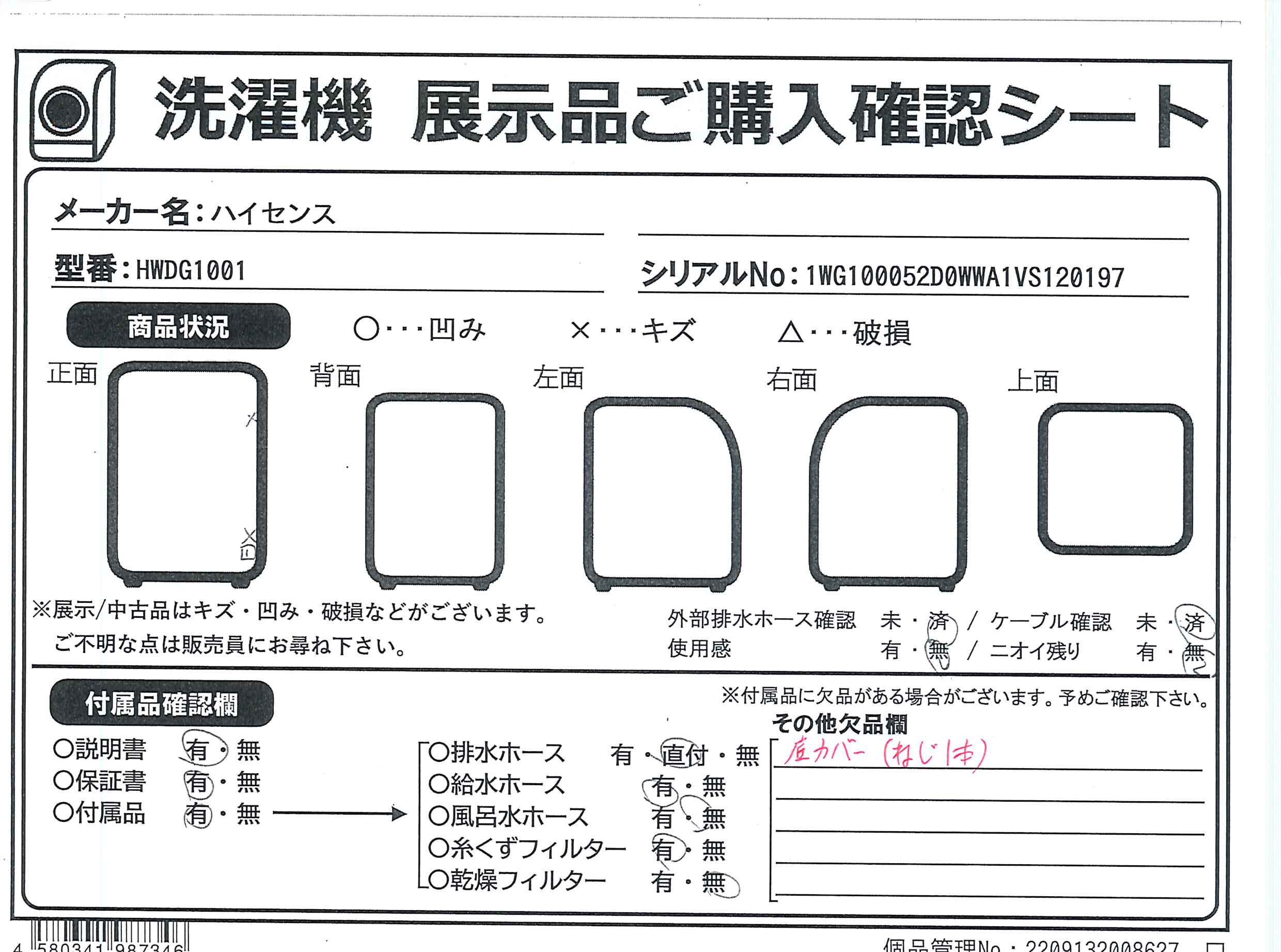 中古商品ランクについて 付属品・商品状態について 〔付属品〕取扱説明書、給水ホース、給水つぎ手、排水スリーブ、糸くずフィルター×2、Wi-Fi洗濯機用・取扱説明書