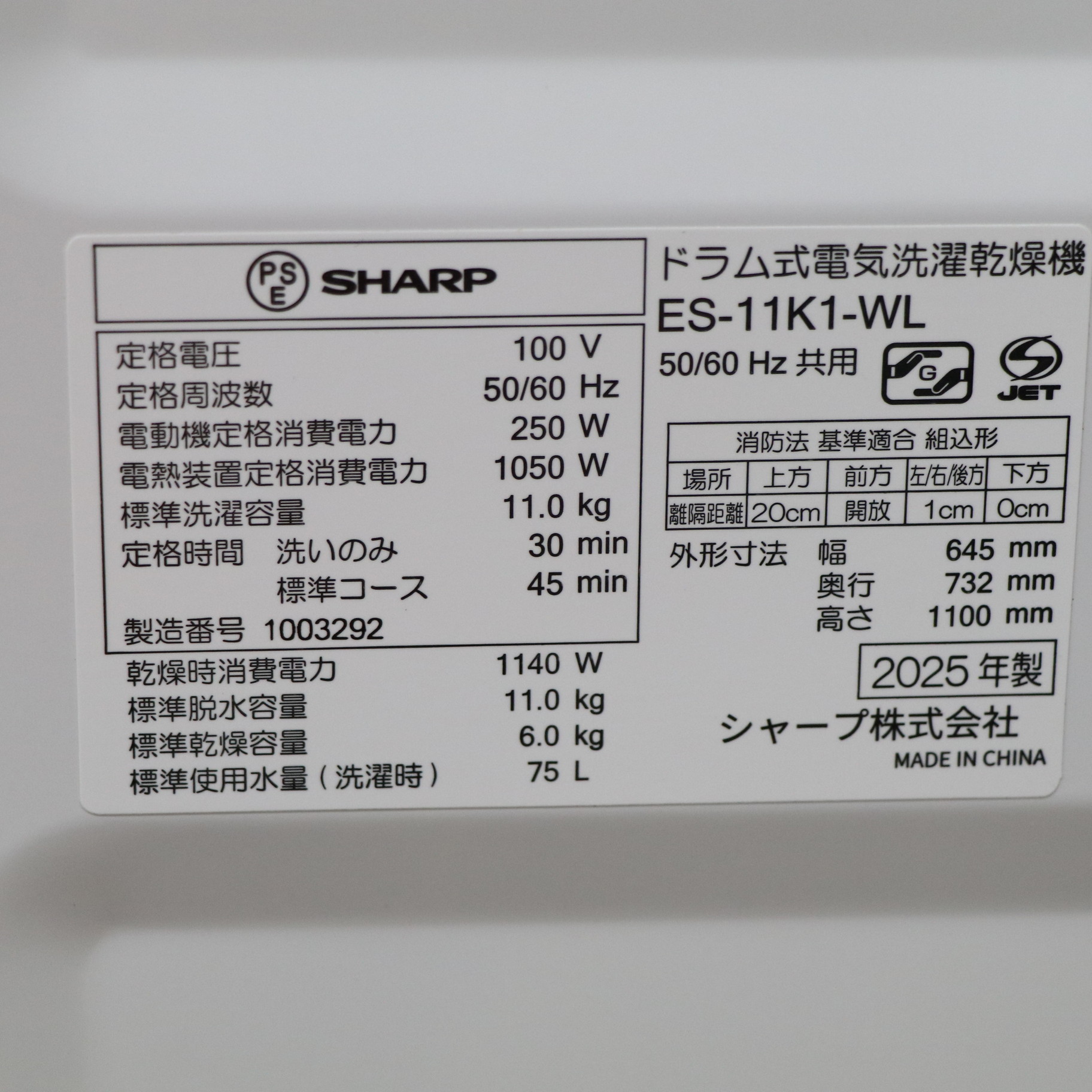 ※4 ・試験機関:シャープ試験 ・試験方法:静電気が発生しやすポリエステル100%衣類(2kg)を洗濯〜乾燥運転(乾燥120分)後、ドラム内の衣類の帯電量を測定 ・対象部分:ドラム内の衣類 ・試験結果:シャープ2020年度モデルES-H10E(プラズマクラスターなし)に比べ約86%低減(乾燥2kg時)、プラズマクラスターあり:2.87kV、プラズマクラスターなし:2000kV ・イオン濃度:約350000個/m3(ドラム中央部) ・試験機種:ES-H10E(2020年度モデル、ES-11K1と同等)