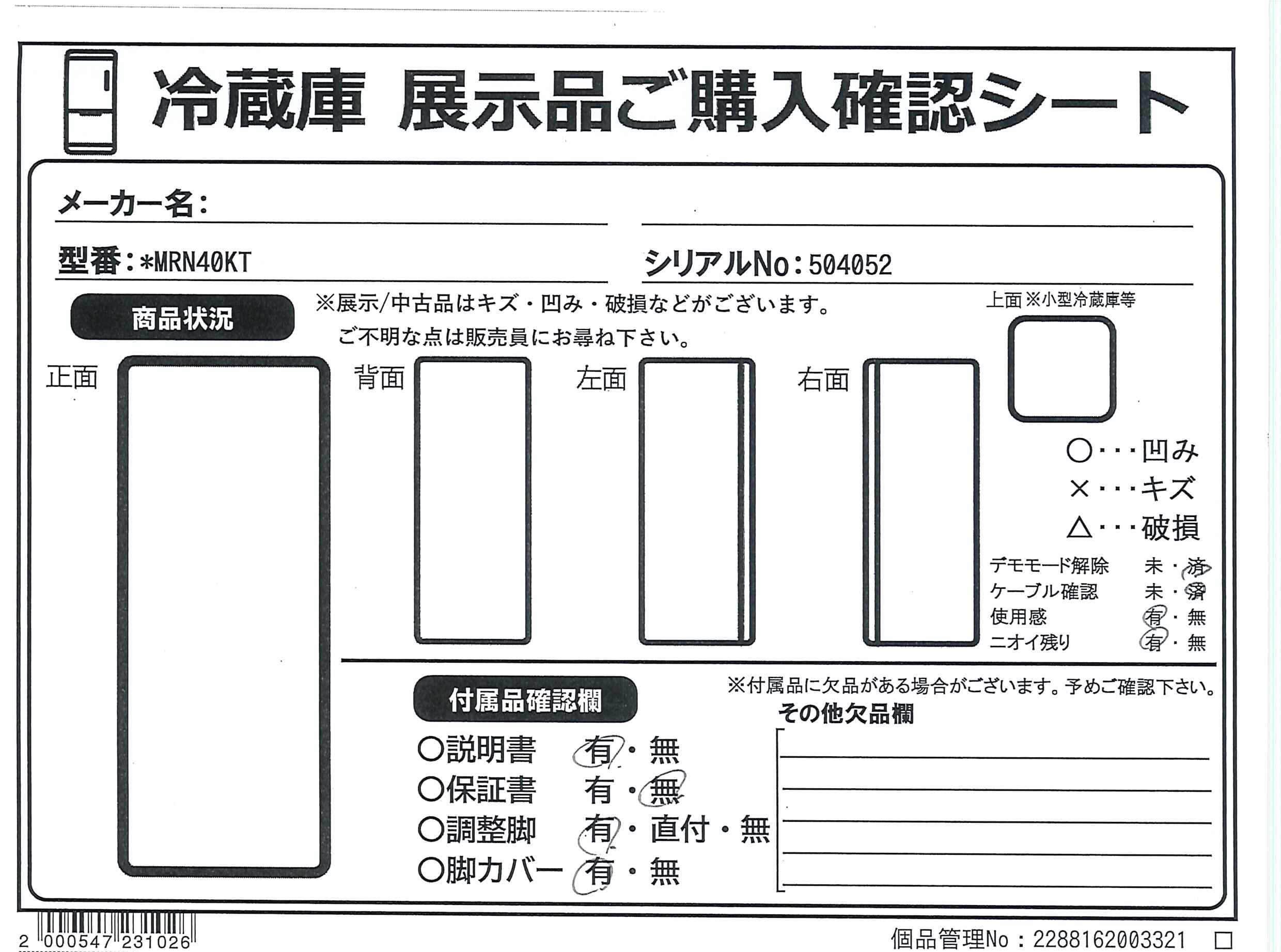 中古商品ランクについて 付属品・商品状態について 〔付属品〕取扱説明書、調整脚×2、脚カバー、ガラスシェルフ×2、ワン・ツー棚、ワイドチルドケース、氷点下ストッカーケース、給水タンク(浄水フィルターつき)、フリーポケット(大)、フリーポケット(小)、小物ポケット、タマゴトレイ、ボトルポケット、フリーケース(タマゴトレイ付き)、野菜ケース、野菜小物ケース、フリージングケース(上)、フリージングケース(下)、防音マット、アイスサーバー