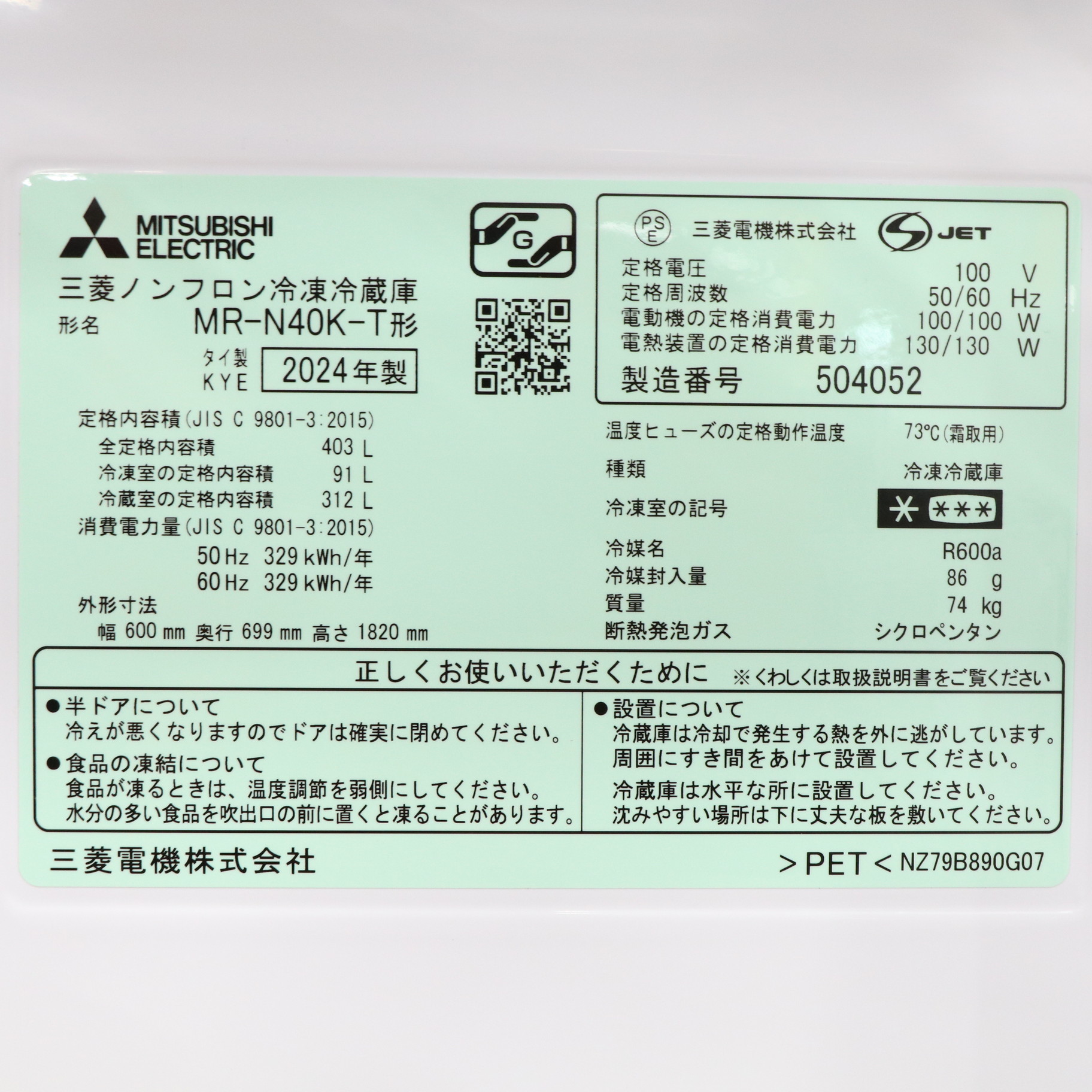 〔中古品〕 冷蔵庫 Nシリーズ ダークブラウン MR-N40K-T [幅60cm /403L /4ドア /右開きタイプ /2024年]
