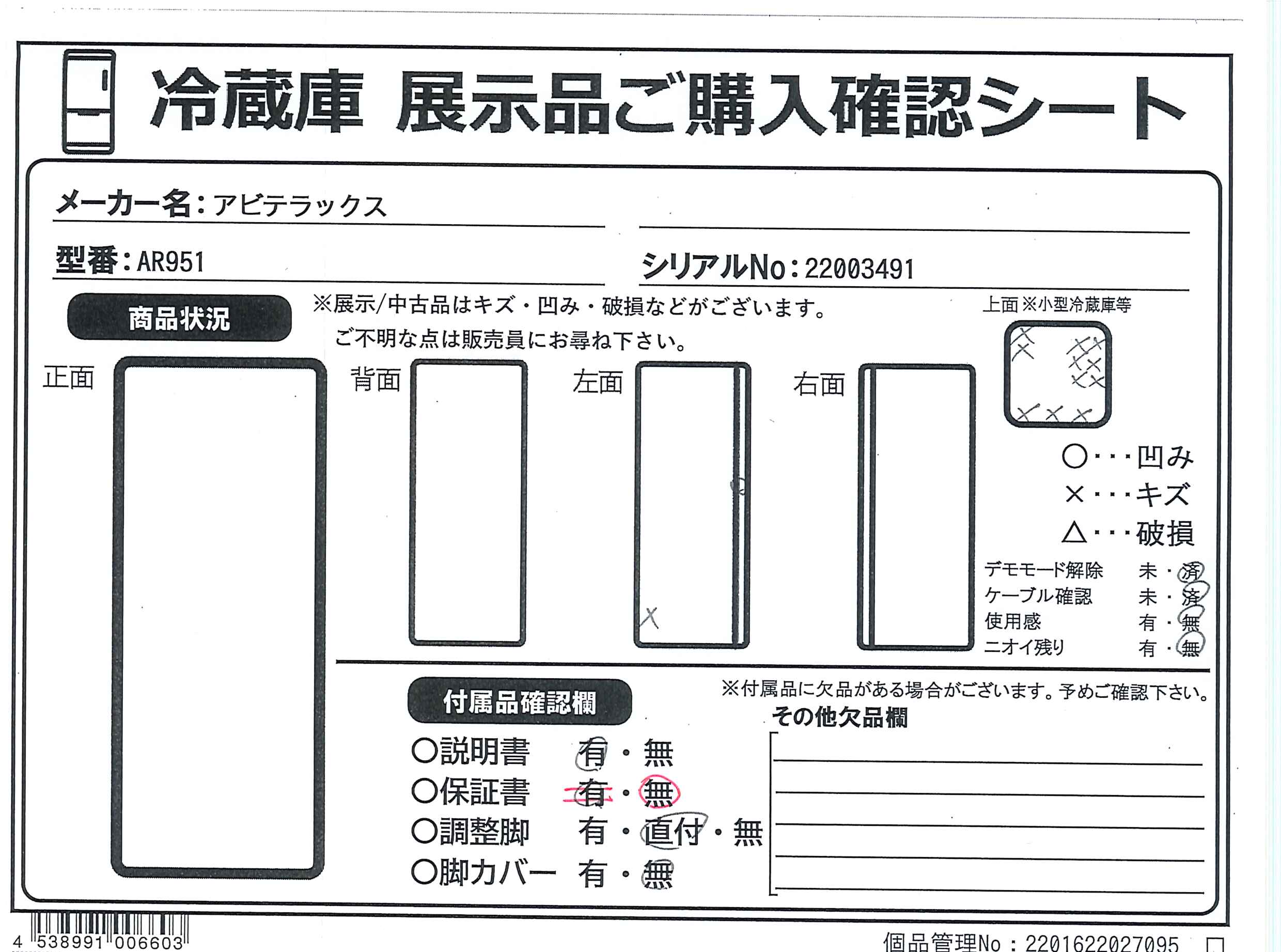 中古商品ランクについて 付属品・商品状態について 〔付属品〕説明書、霜取り用ヘラ、製氷皿、卵容器×2、アイスBOX、蒸発皿、調整脚×2、野菜容器、野菜容器棚、冷蔵室棚