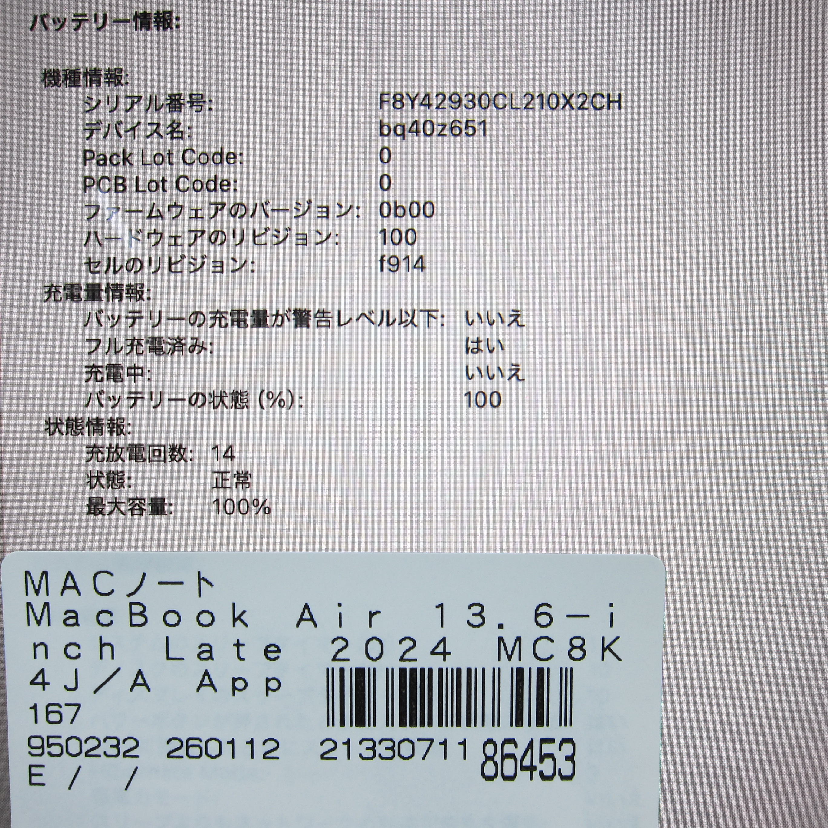 〔中古品〕 MacBook Air 13.6-inch Late-2024 MC8K4J/A Apple M3 8コアCPU_8コアGPU 16GB SSD256GB ミッドナイト 〔15.3 Sequoia〕 [グラフィック:オンボード/JISキーボード]