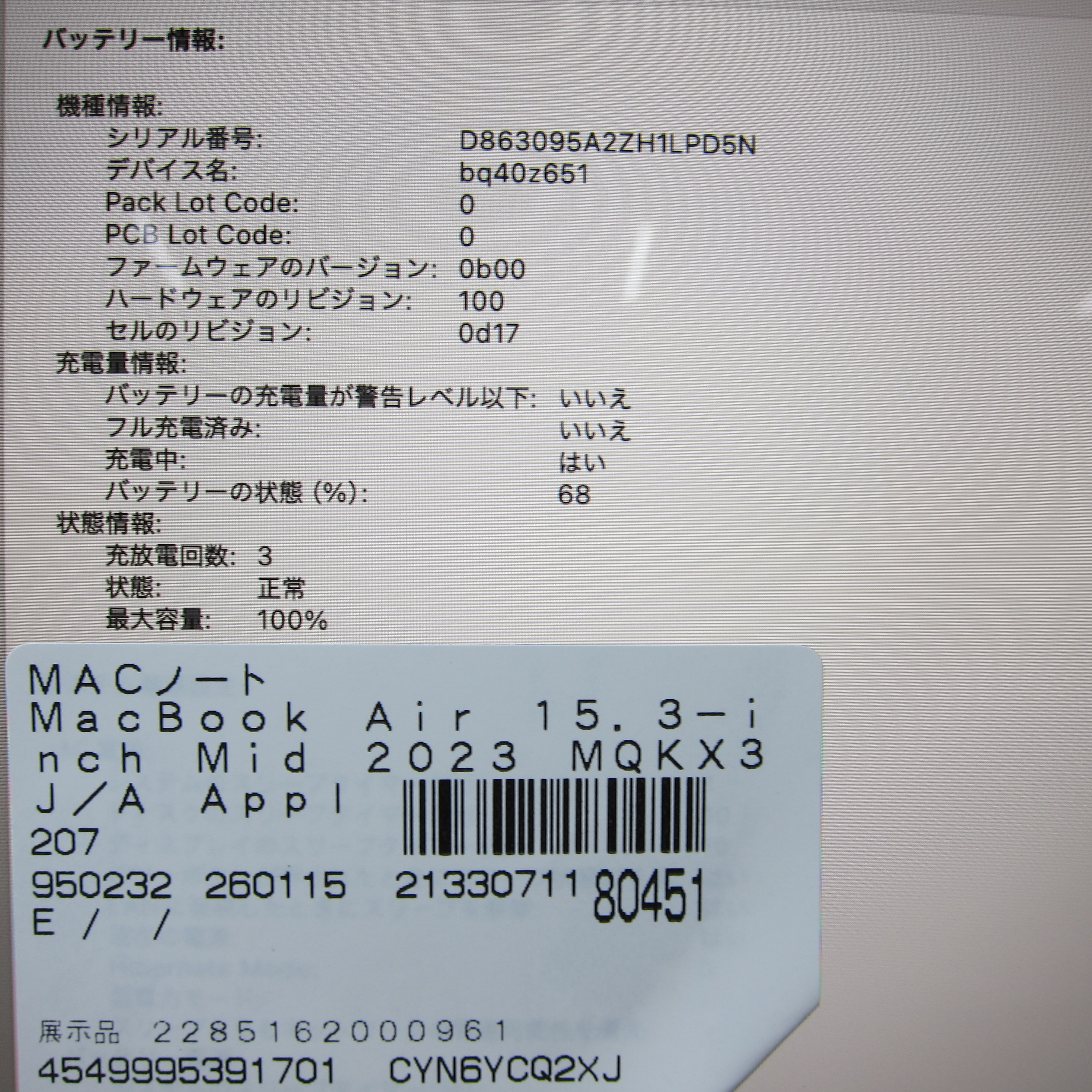 〔展示品〕 MacBook Air 15.3-inch Mid-2023 MQKX3J/A Apple M2 8コアCPU_10コアGPU 8GB SSD512GB ミッドナイト 〔15.7 Sequoia〕 [グラフィック:オンボード/JISキーボード]