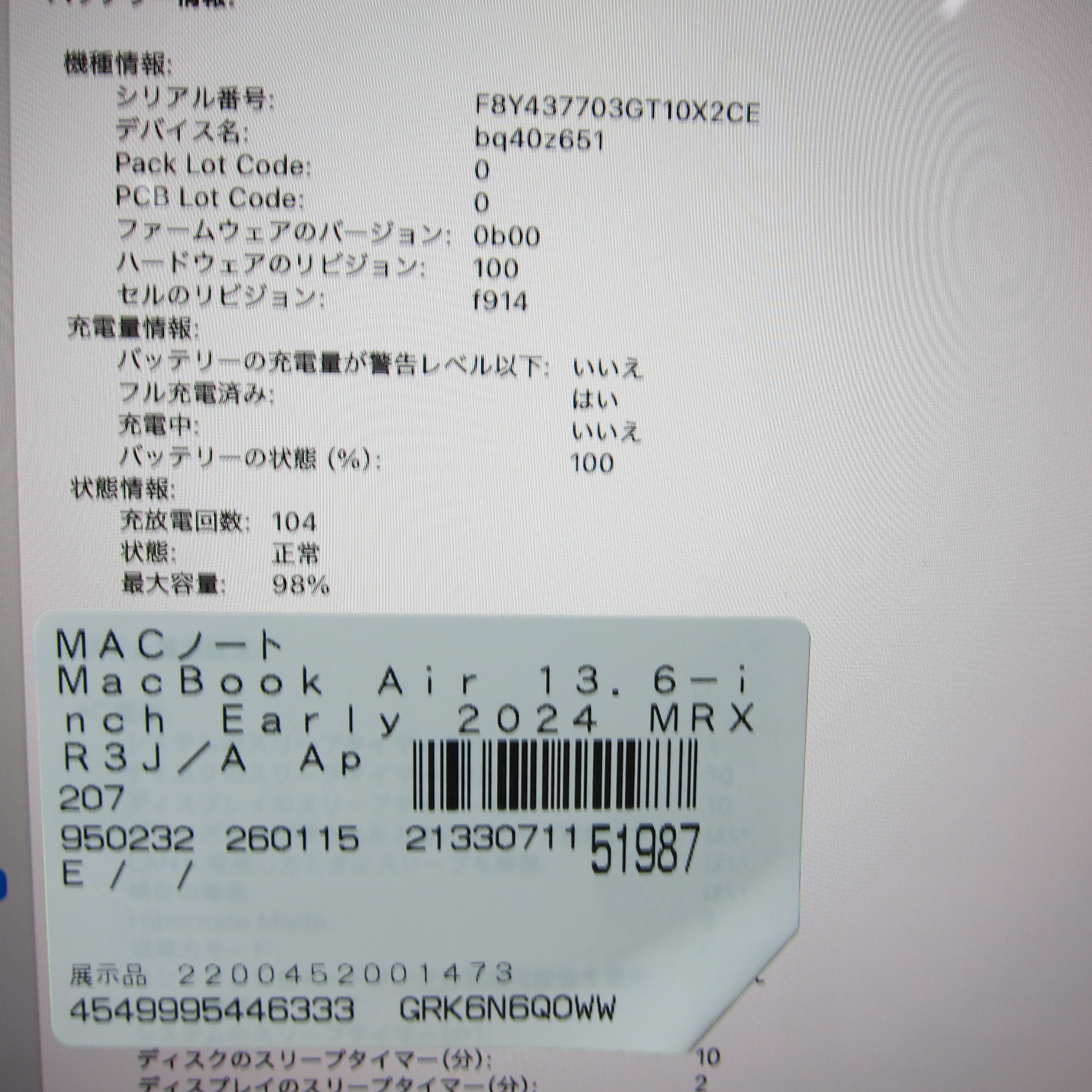 〔展示品〕 MacBook Air 13.6-inch Early-2024 MRXR3J/A Apple M3 8コアCPU_10コアGPU 16GB SSD512GB シルバー 〔15.7 Sequoia〕 [グラフィック:オンボード/USキーボード]